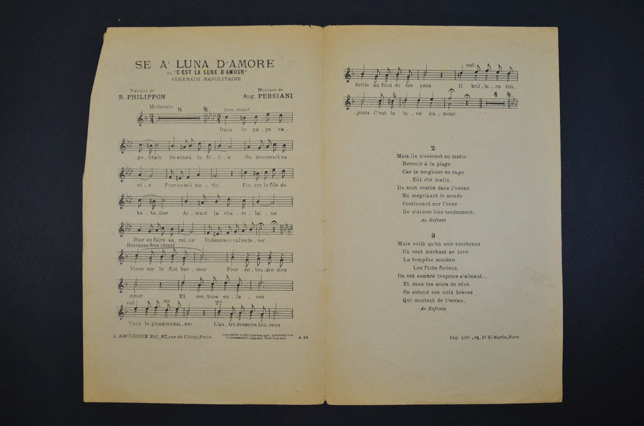 papier imprimé / Feuillet rectangulaire en papier industriel imprimé. Le feuillet contient la partition et les paroles de la chanson. Au dos, publicité pour l'éditeur.Décor