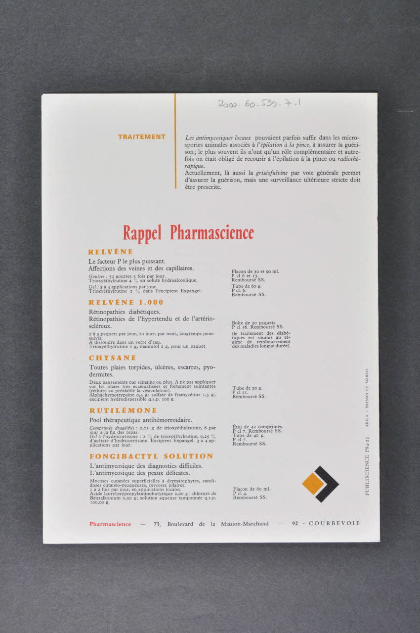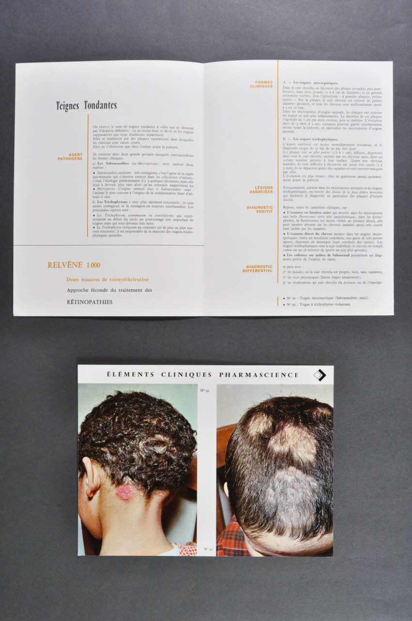 La chemise est faite d'une double-page de papier blanc imprimé, avec le devant jaune orangé à bandeau inférieur blanc. La fiche .2 est en papier glacé, comportant au recto deux photographies de sommets de crâne aux cheveux épars, dont l'un avec éruption rose à la base, et au verso des inscriptions présentant un médicament.Inscriptions