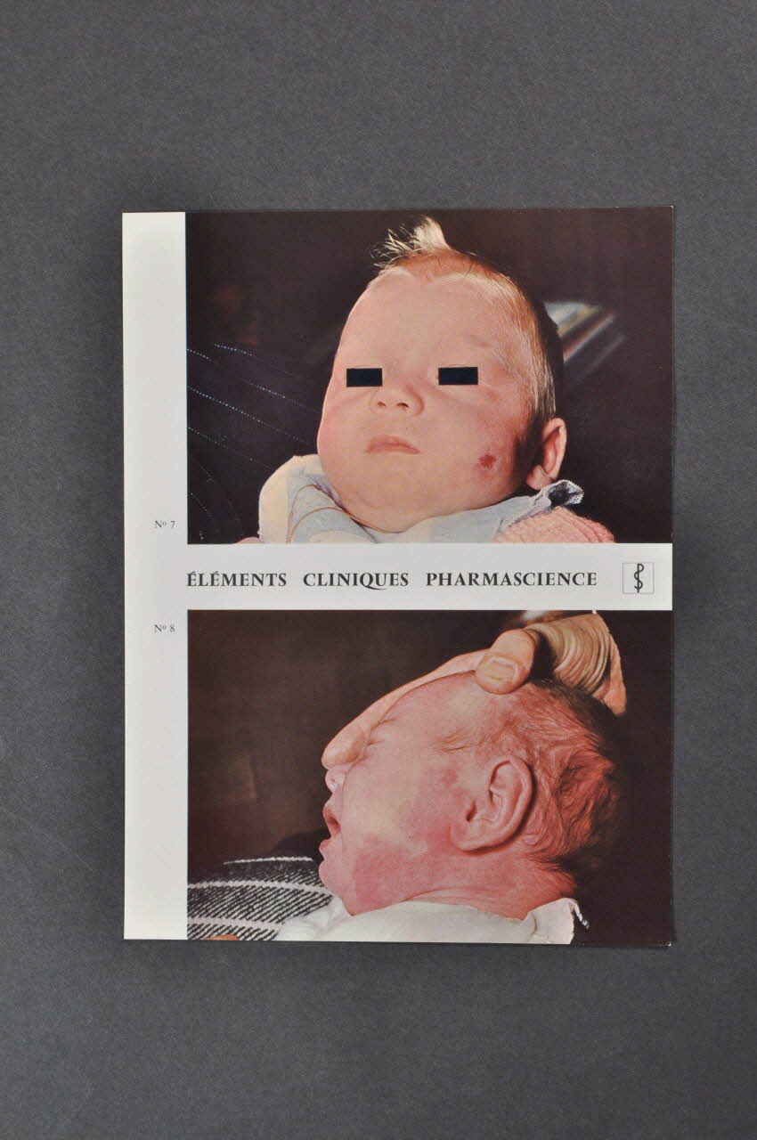 Le recto est composé de deux photographies couleur numérotées : en haut, le visage d'un bébé blond avec une petite affection cutanée sur le bas de la joue gauche. Des rectangles foncés ont été imprimés sur ses yeux. L'image du bas est un profil de bébé avec une tache rouge violacée sur le cou et le bas de la joue gauche. Le verso est constitué d'un texte de présentation d'un médicament en noir avec des titres ocres.Inscriptions
