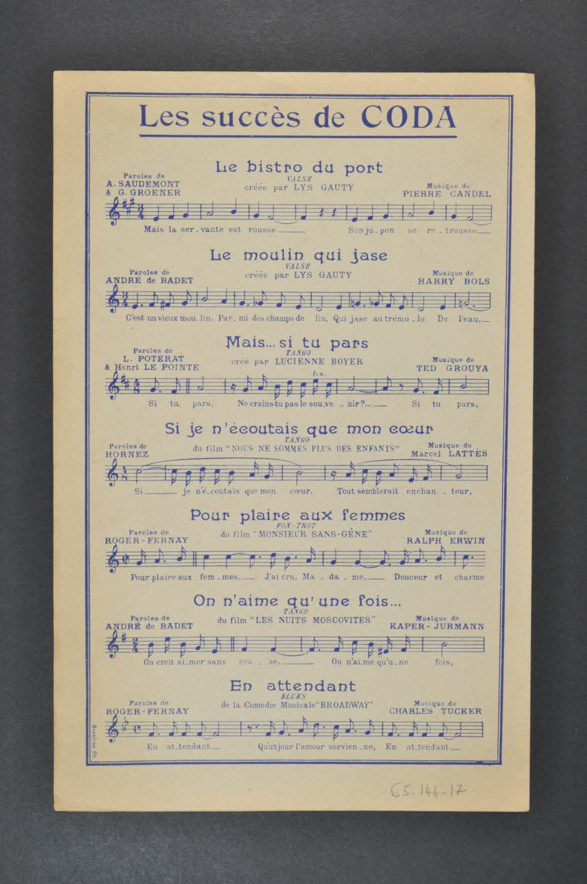 Des inscriptions renseignent le titre, les auteurs, les exécutants et l'éditeur. A l'intérieur, partition et paroles de la chanson. Au dos, liste d'autres partitions publiées par l'éditeur.Décor