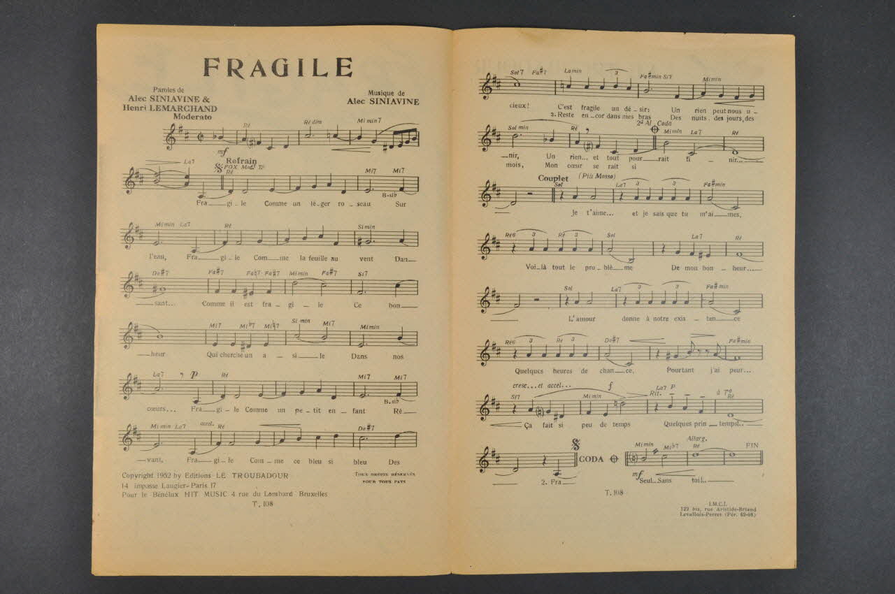Les inscriptions renseignent le titre de la chanson, le nom des auteurs, de l'artiste et de l'éditeur. A l'intérieur, partitions et paroles de la chanson. Au dos, liste d?autres partitions publiées par l?éditeur.Décor