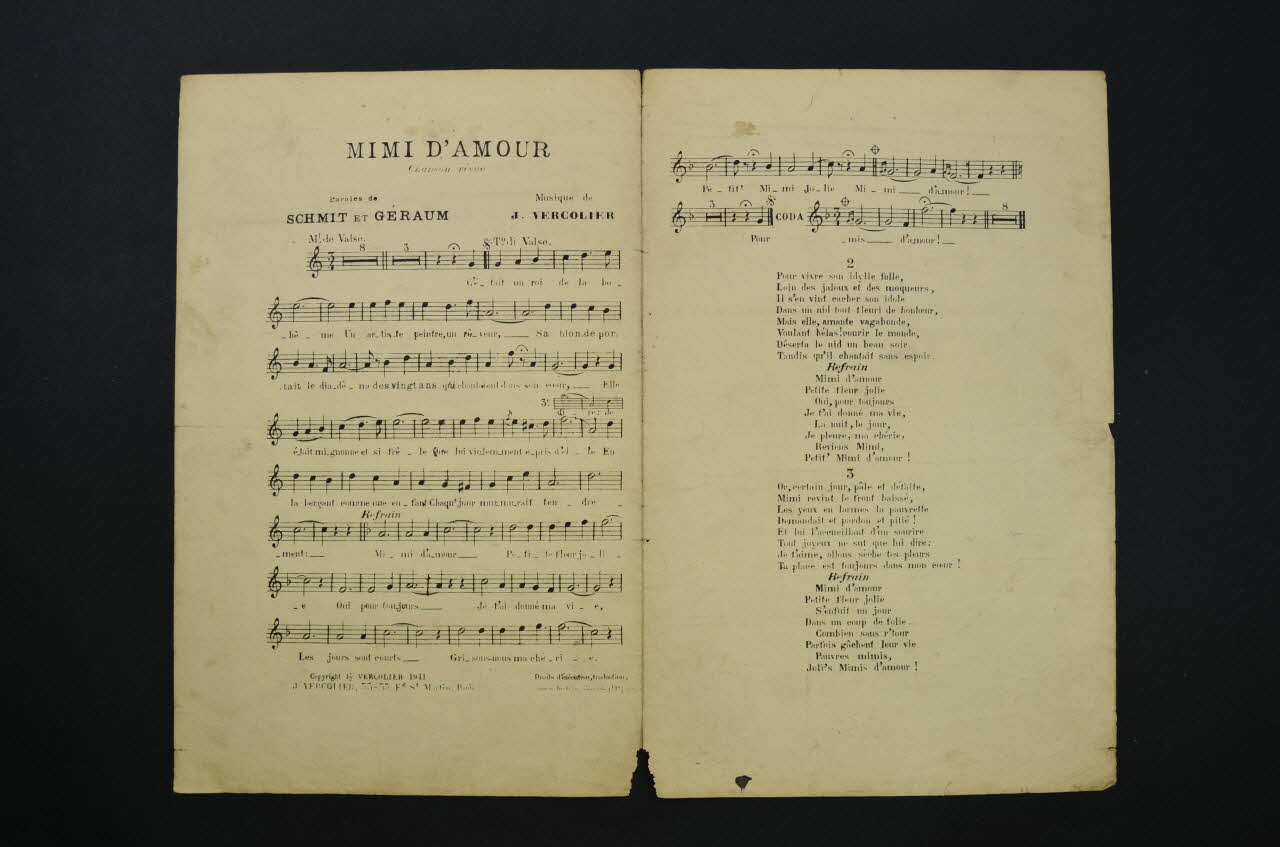Les inscriptions renseignent le titre de la chanson, le nom des auteurs, de l'artiste et de l'éditeur. A l'intérieur, partitions et paroles de la chanson. Au dos, liste d?autres partitions publiées par l?éditeur.Décor