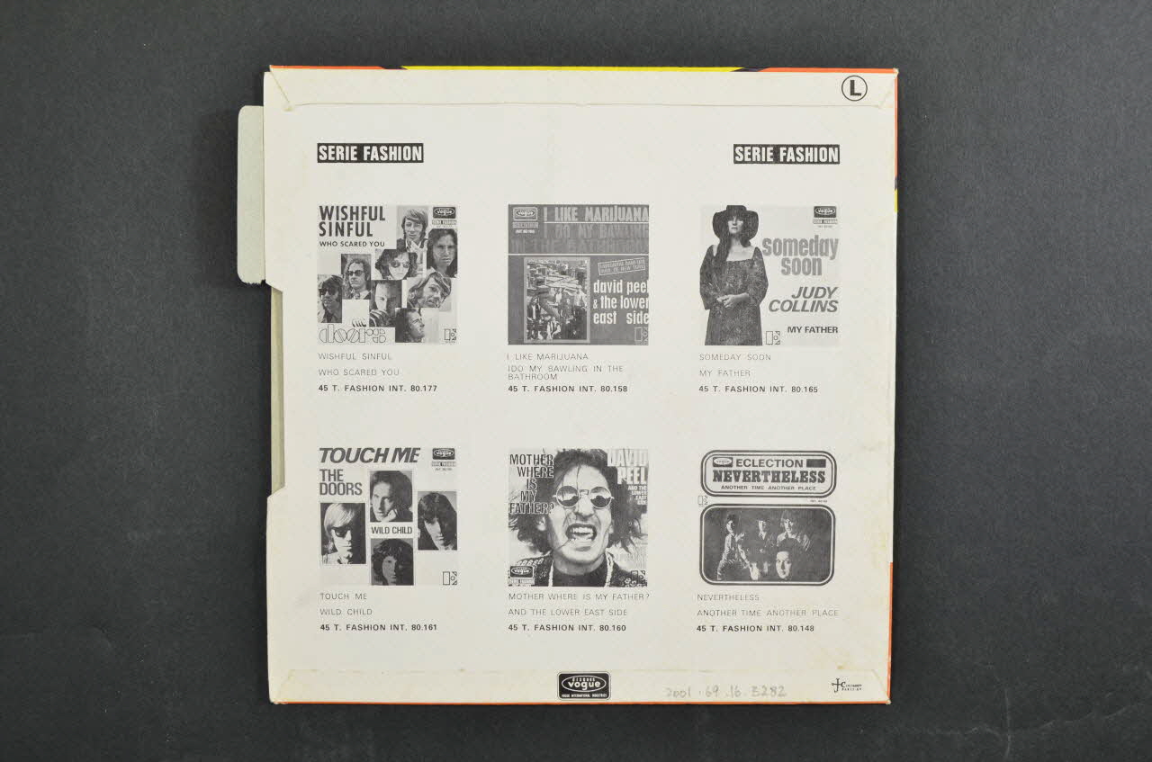 Au recto le fond est orange avec un nuage jaune et bleu. Au centre figure une inscription en jaune et rouge. Au verso, le fond est blanc avec des inscriptions noires avec six photos en noir et blanc de pochettes de disque.Matériaux et techniques