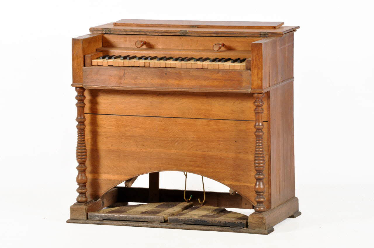 1969.33.28.1 : Harmonium, meuble en bois de forme rectangulaire à deux pédales de forme semi circulaire recouvertes d'un tissu de laine à carreaux marron et beige.
