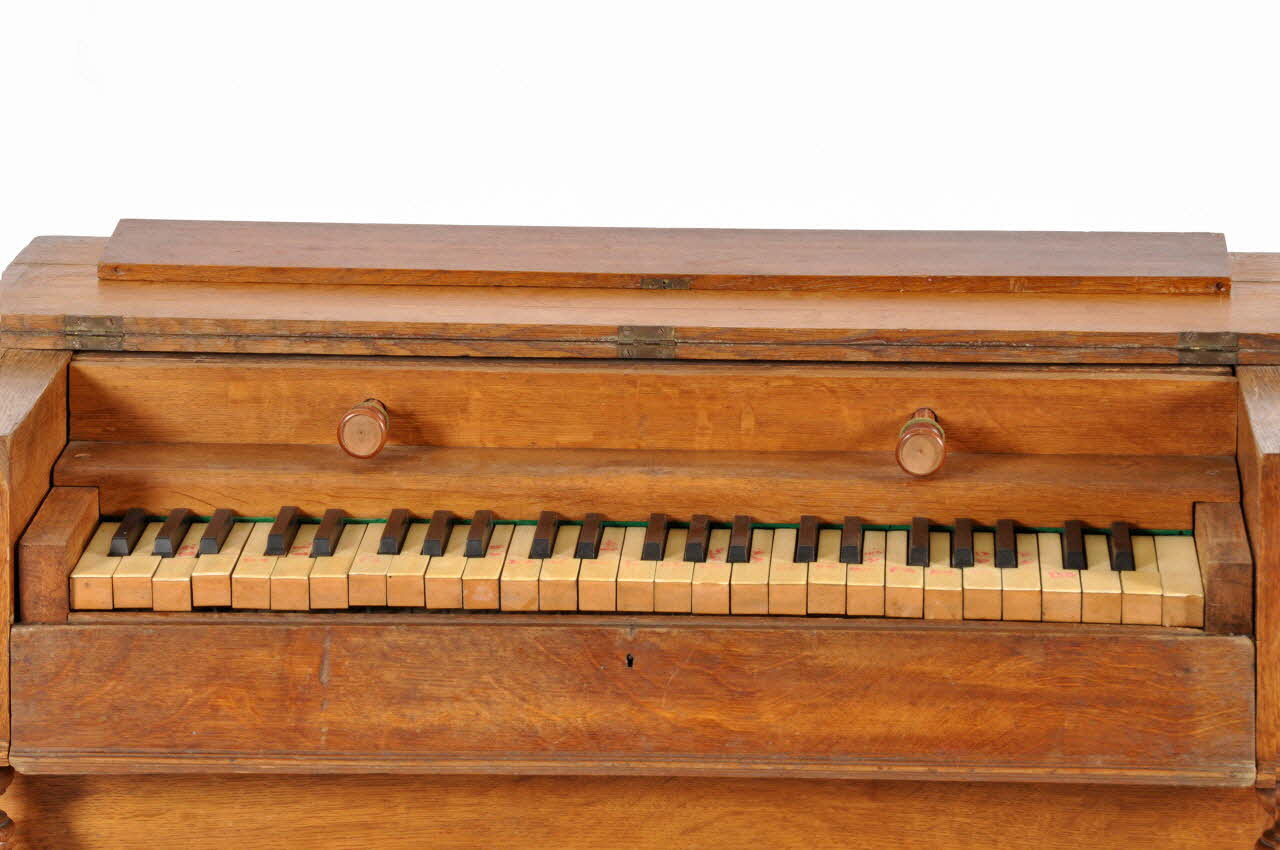 La face avant, est ornée de deux colonnes en bois tournées supportant avec délicatesse le cache-clavier (1969.33.28.2) en bois de forme rectangulaire fixé sur les côtés par un petit loquet métallique. Ensuite, se trouve le clavier, dont la base est recouverte d'un tapis vert servant d'amortisseur. il possède vingt-neuf touches en ivoire inscrites d'une note musicale à l'encre rouge. Au dessus du clavier, se trouvent les étouffoirs: deux boutons en bois fixés à une tige qui actionnent deux planches rectangulaires qui viennent couvrir trois et six évidements circulaires au dessus de marteaux. Le clavier et les boutons sont protégés par un couvercle fixé sur le dessus par trois petites chanières en métal et muni d'un panneau articulé qui vient cacher le clavier en possition fermé. Sur le même plan que le couvercle, à l'arrière, se trouve un deuxième couvercle en bois est fixé par deux charnières en métal. Avant d'accèder au mécanisme, un troisième couvercle (1969.33.28.3) en tissu collé à un cadre en bois. Au dos, la moitié supérieure est couverte d'un panneau en bois et la deuxième moitié est ouverte permettant de voir le mécanisme de soufflerie composé de papier et peau collés. Les deux pédales actionnent des soufflets différents, qui eux mêmes allimentent un soufflet général lié au mécanisme du clavier par un seul tuyau.Matériaux et techniques