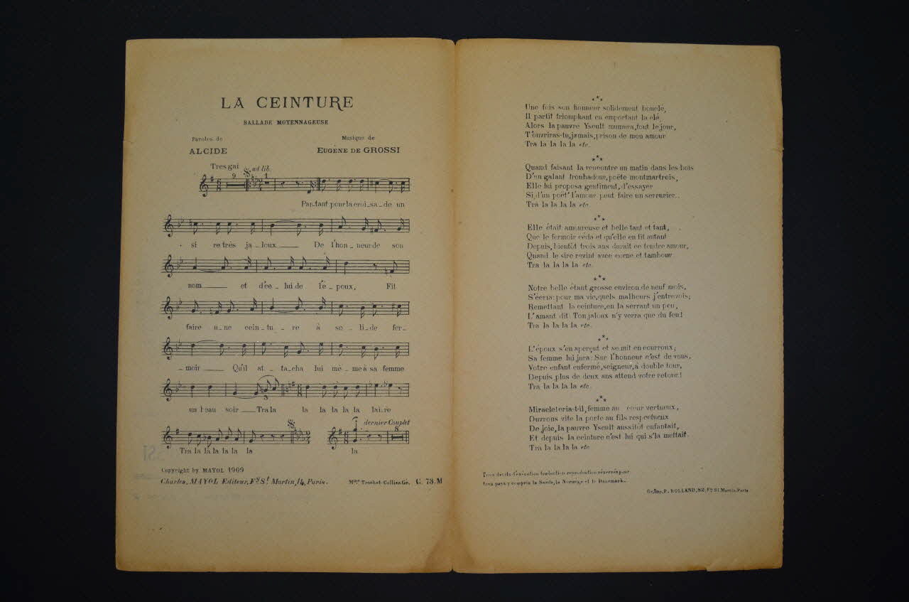 Feuillet rectangulaire en papier industriel imprimé. Le feuillet contient la partition et les paroles de la chanson. Au, dos, publicité pour l'éditeur.
