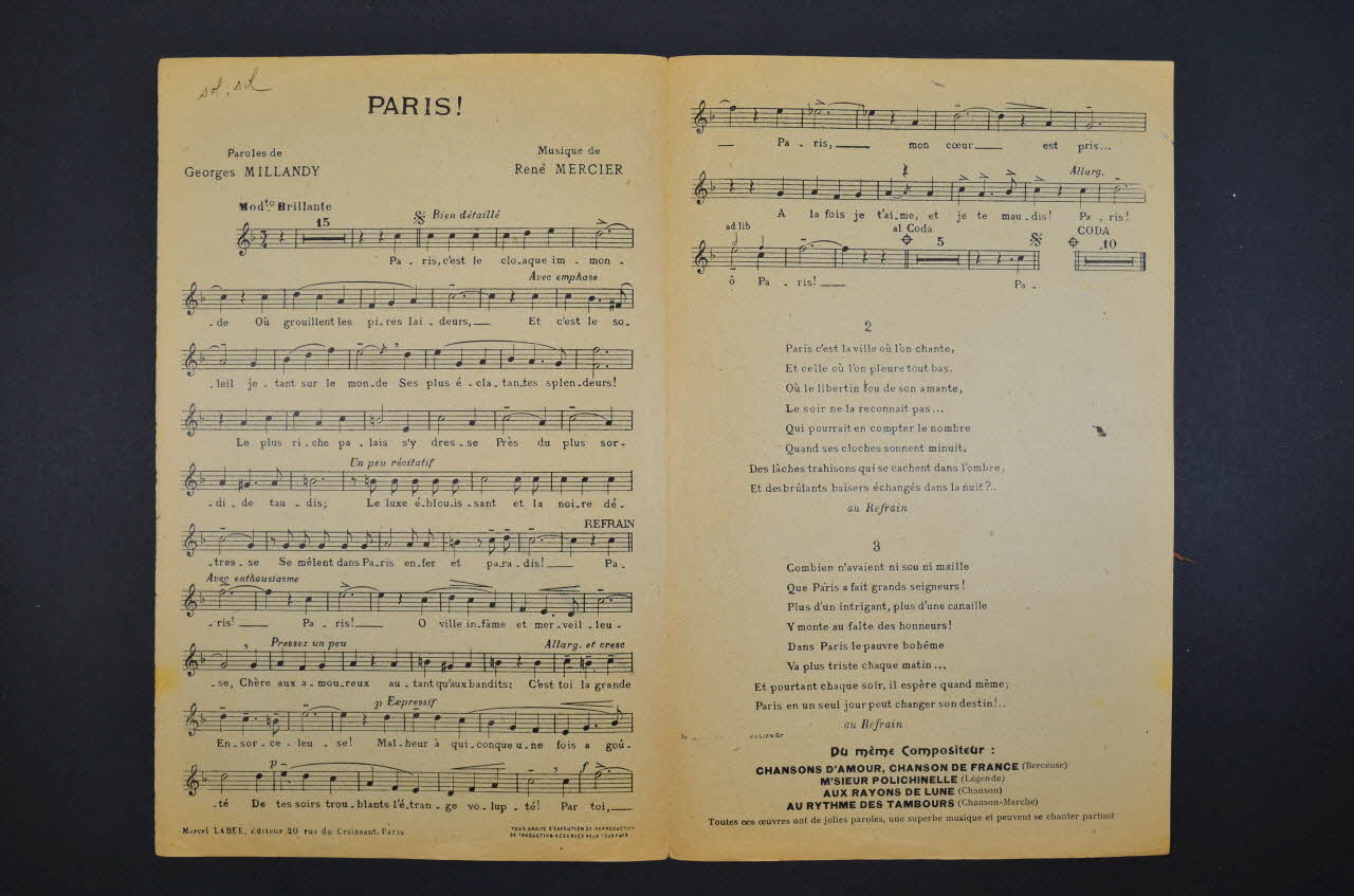 Feuillet rectangulaire en papier industriel imprimé. Le feuillet contient la partition et les paroles de la chanson. Au dos, publicité pour l'éditeur.Matériaux et techniques