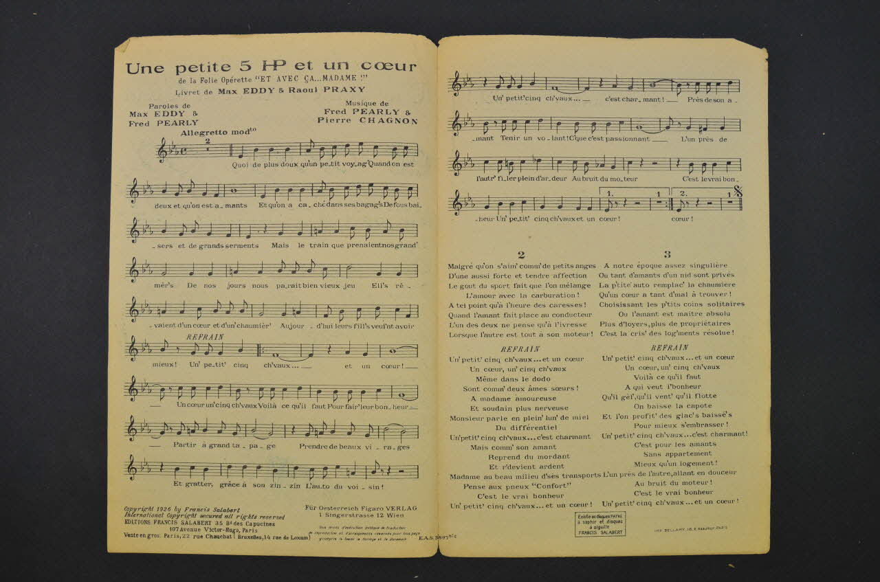 Les inscriptions renseignent le titre de la chanson, le nom des auteurs, de l'artiste et de l'éditeur. A l'intérieur et au dos, les partitions et les paroles des chansons.Décor