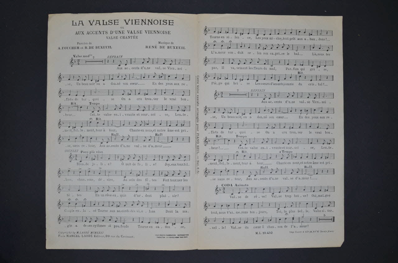 Sur la couverture, dans la partie basse, le portrait photographique de René de Buxeuil jouant du piano ; au-dessus, les portraits photographiques en médaillon de Carmen Vildez et Grégoire, encadrant celui, rectangulaire, de Vorelli. Les inscriptions renseignent le titre de la chanson, le nom des auteurs, des artistes et de l'éditeur. A l'intérieur, partition et paroles de la chanson. Au dos, liste d'autres partitions publiées par l'éditeur.Décor