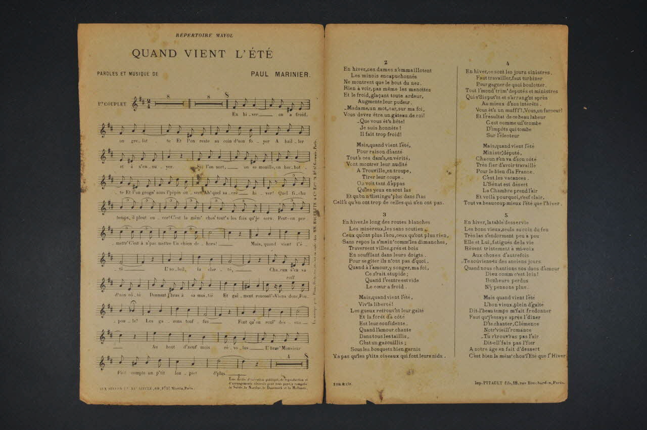 Les inscriptions renseignent le titre de la chanson, le nom des auteurs, de l'artiste et de l'éditeur. A l'intérieur, partitions et paroles de la chanson. Au dos, liste d?autres partitions publiées par l?éditeur.Décor