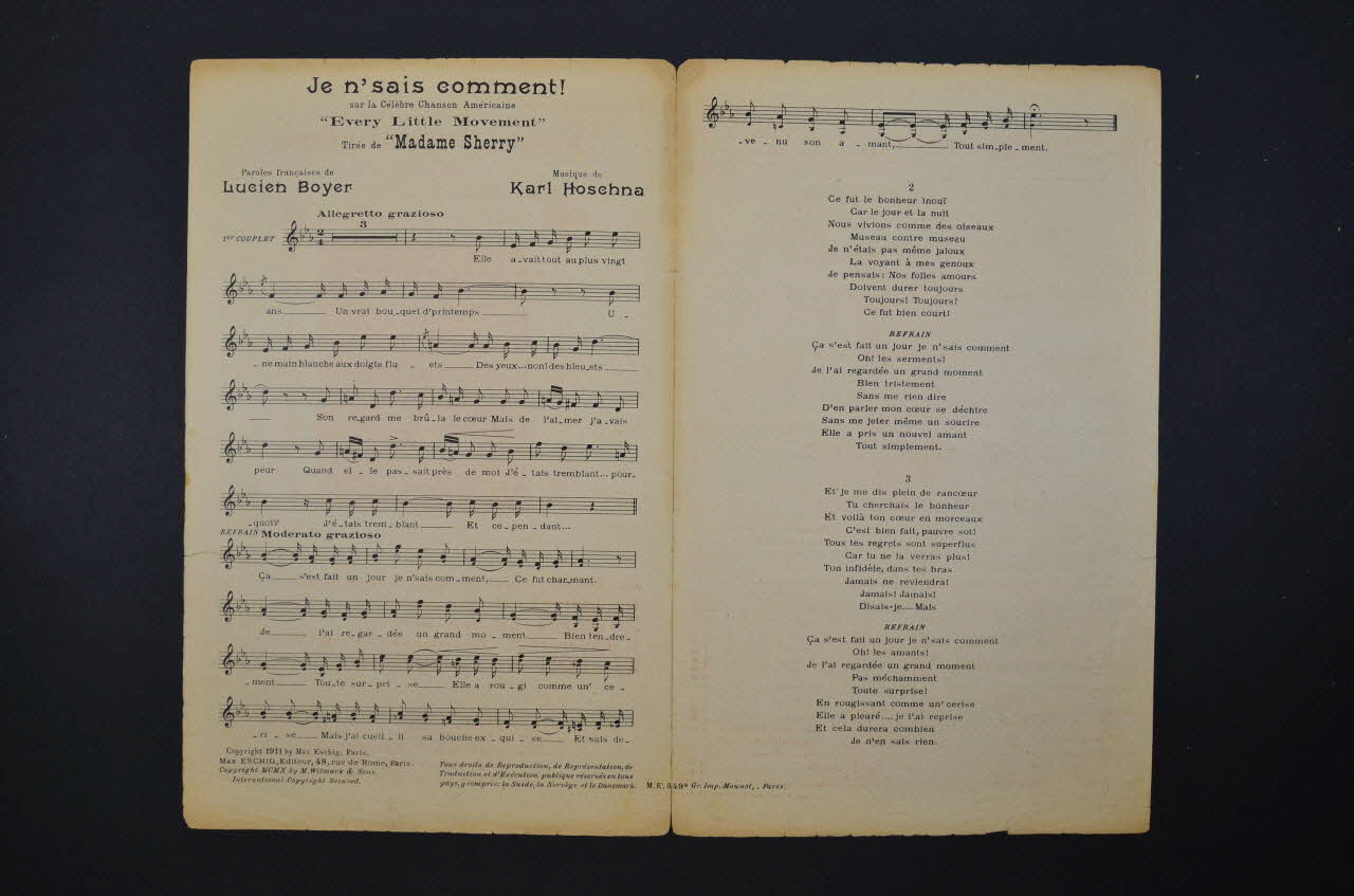 Feuillet rectangulaire en papier industriel imprimé. Le feuillet contient la partition et les paroles de la chanson. Au dos, publicité pour l'éditeur.