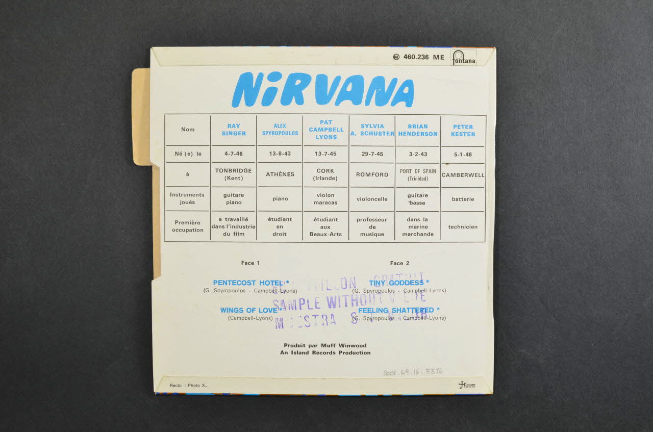 De forme carrée, la pochette est en carton, imprimée en couleur, pliée et collée. Les inscriptions sont en anglais. Une étiquette saillante se trouve au niveau supérieur du bord droit.