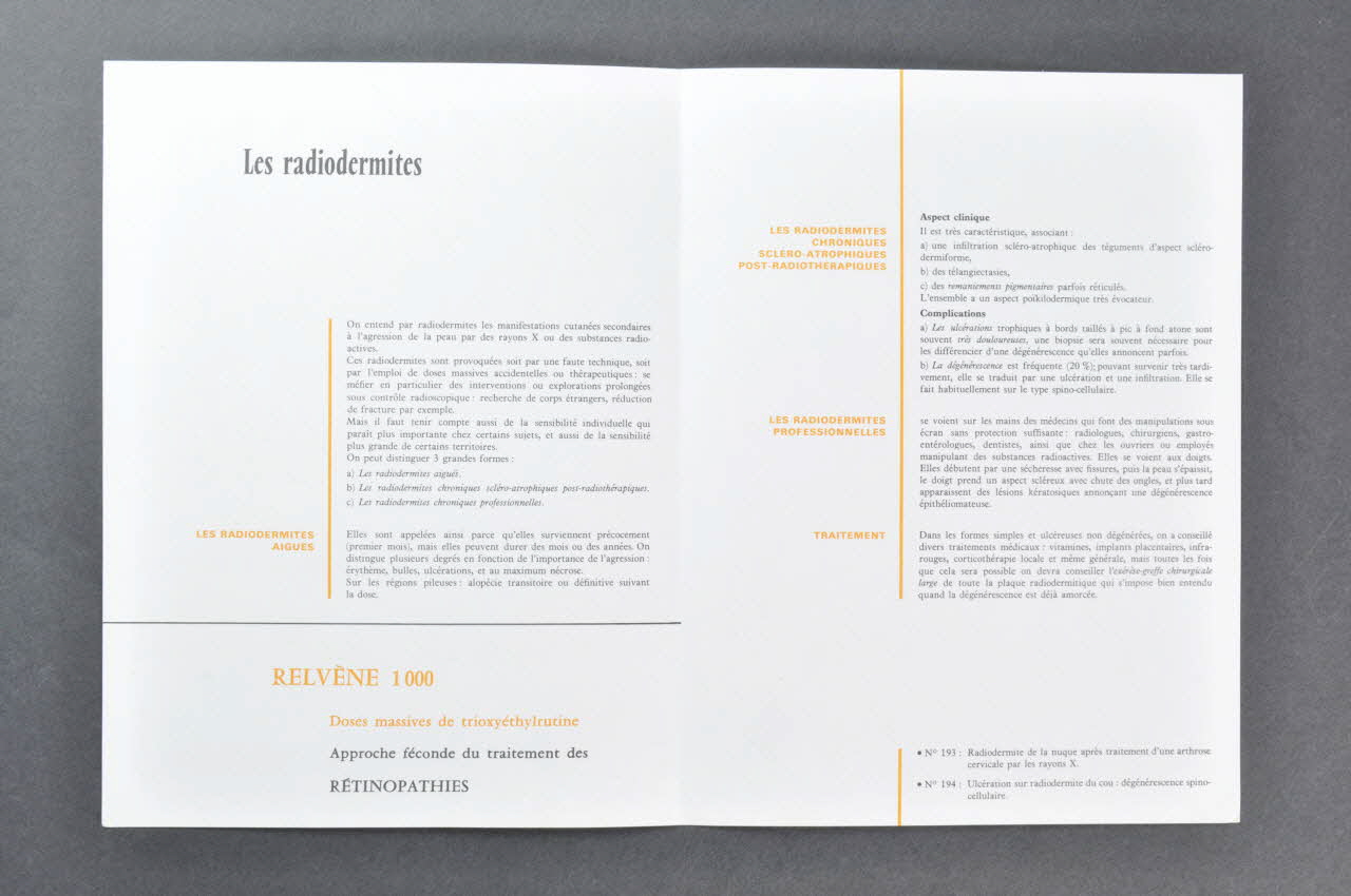 La chemise est faite d'une double-page de papier blanc imprimé, avec le devant jaune orangé à bandeau inférieur blanc. La fiche .2 est en papier glacé, comportant au recto deux photographies : haut de dos et cou avec radiodermites. Le verso comporte des inscriptions présentant un médicament.Inscriptions