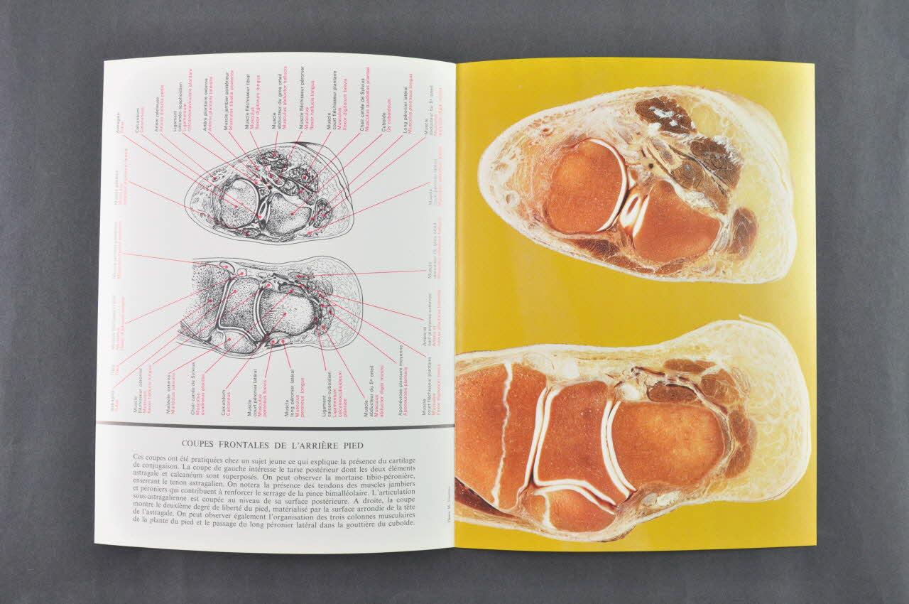 L'intérieur de la brochure présente deux coupes frontales de l'arrière-pied : la page de gauche présente un dessin légendé, la page de droite une photographie sur un fond jaune.Inscriptions
