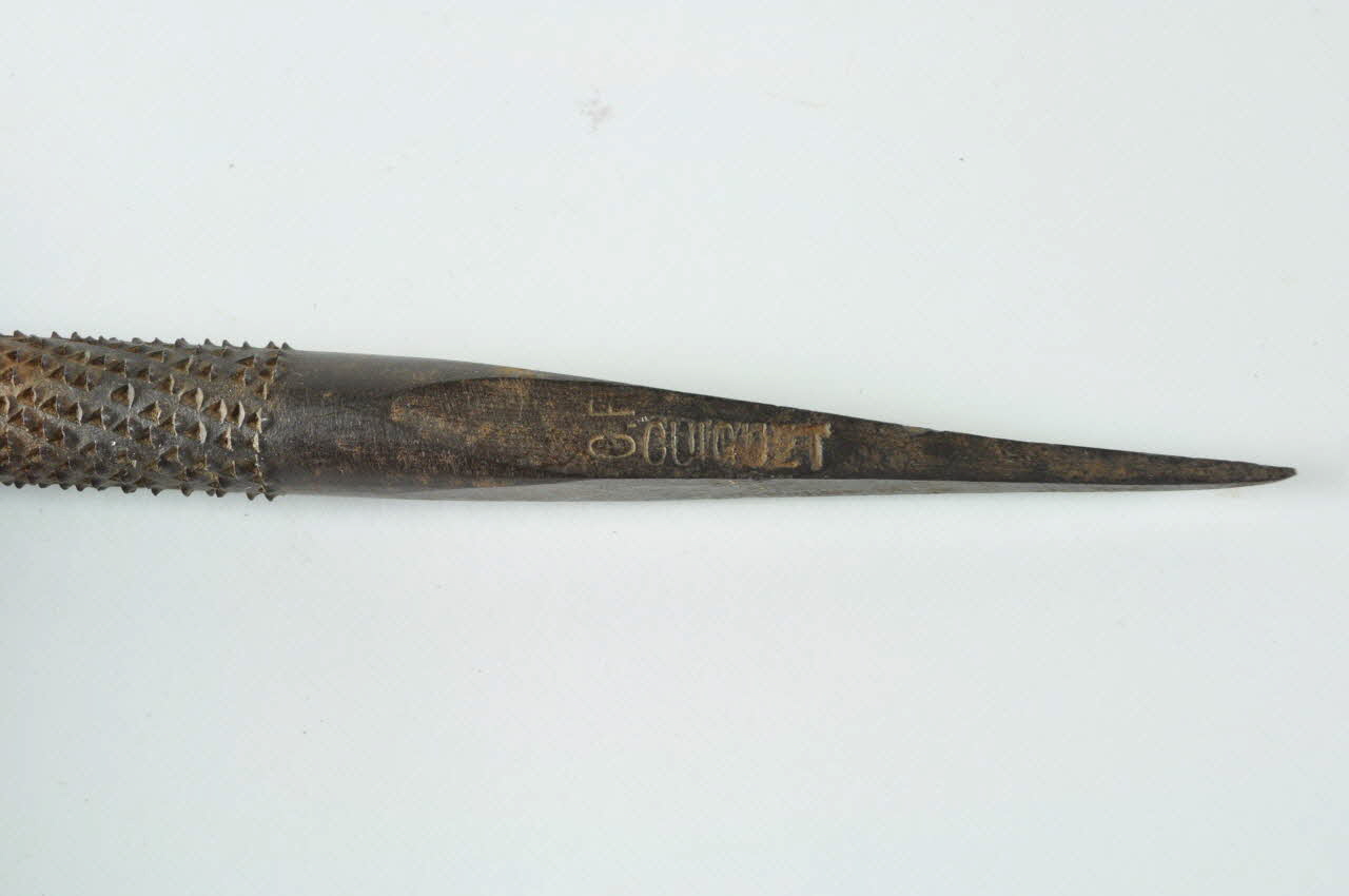 Longue tige cylindrique s'affinant à chacune des extrémités. L'une des extrémités se terminant en pointe est de section carrée. Une inscription gravée dessus est aujourd'hui rendue illisible par la rouille. L'ensemble de la surface présente des motifs triangulaires en creux en alternance avec des motifs triangulaires en relief.Matériaux et techniques
