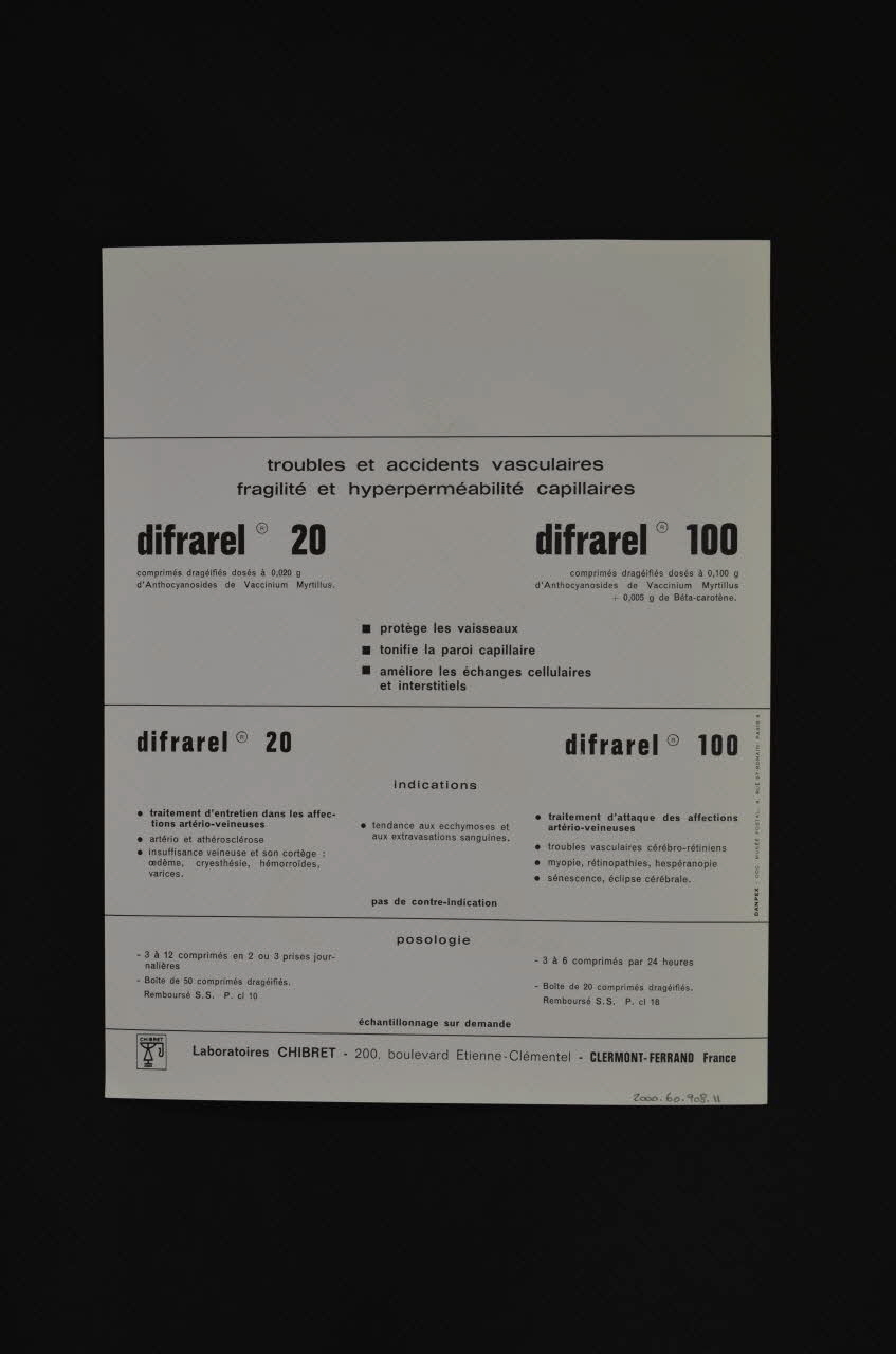 troubles et accidents vasculaires // fragilité et hyperperméabilité capillaires // difrarel 20 // [...] // difrarel 100 // [...] // protège les vaisseaux // tonifie la paroi capillaire // améliore les échanges cellulaires et interstitiels // [...] (Imprimé en noir sur blanc), versoDécor