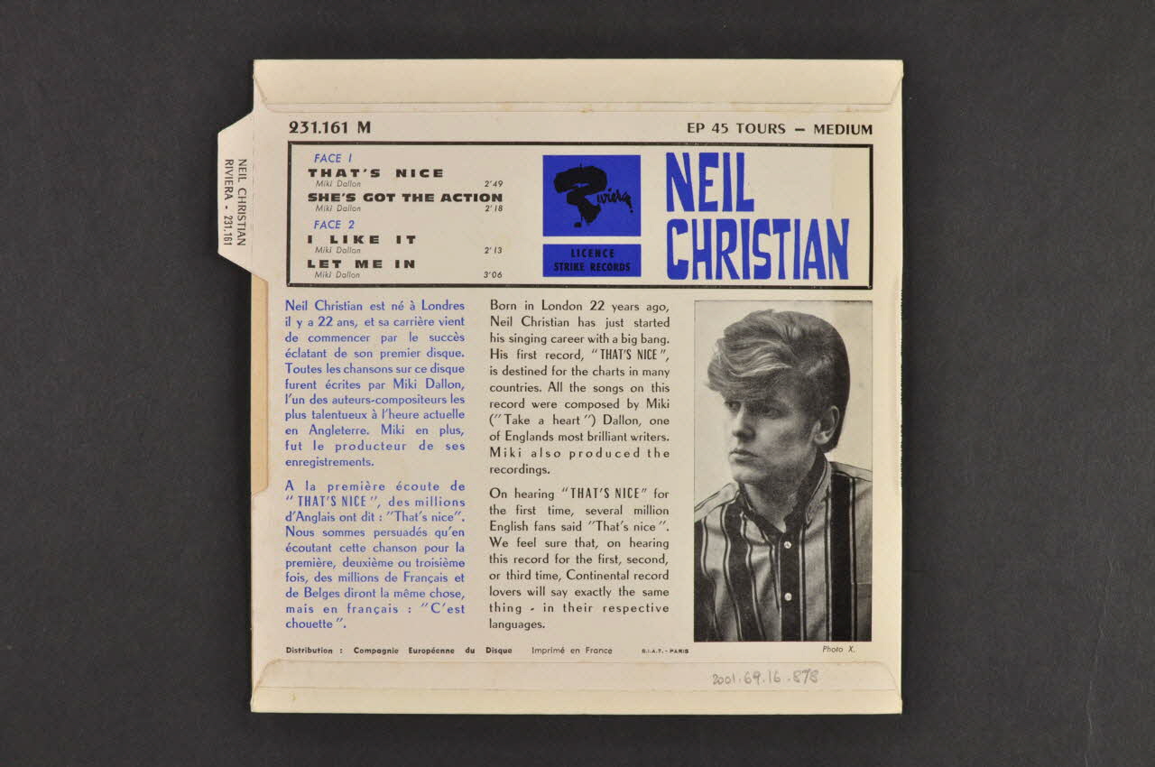 Il s'agit d'une pochette carrée, en carton, imprimée en couleur, pliée et collée. Les inscriptions sont en anglais.