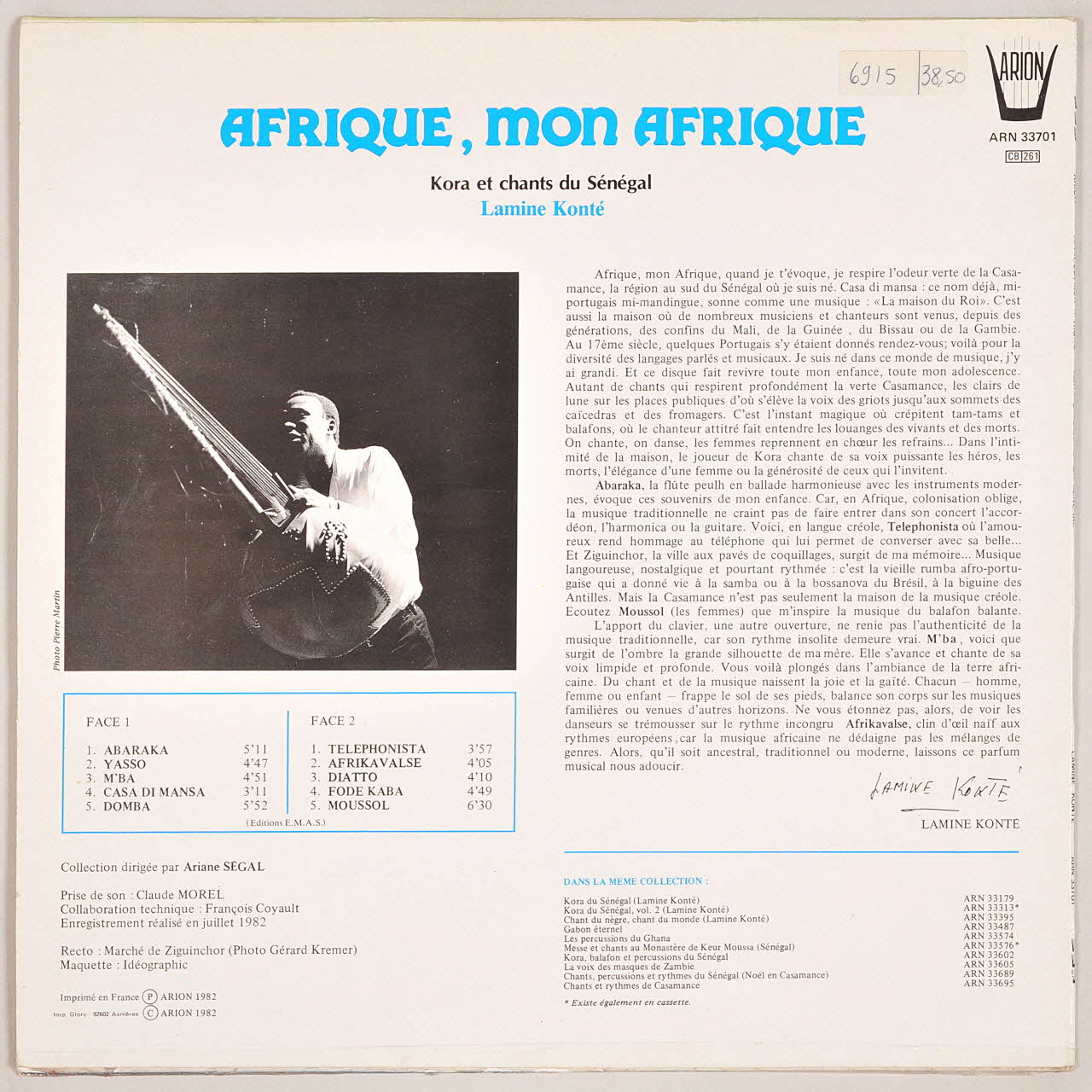 Au verso, une photographie noir et blanc de Konte en train de jouer de la kora sur la gauche. En dessous sont inscrits les titres des chansons. A droite, Konté a rédigé un texte pour expliquer la thématique de cet album. L'étiquette du vinyle est rouge, avec le logo de la maison de disques Arion.Inscriptions