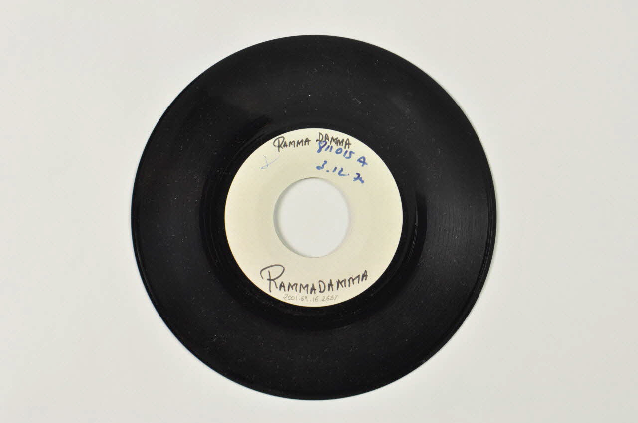 Le disque rond et noir comporte une perforation circulaire au centre. Une étiquette blanche contenant le nom du chanteur, le titre des chansons,le nom de l'éditeur ainsi que d'autres inscriptions en noir est collée au centre.Matériaux et techniques