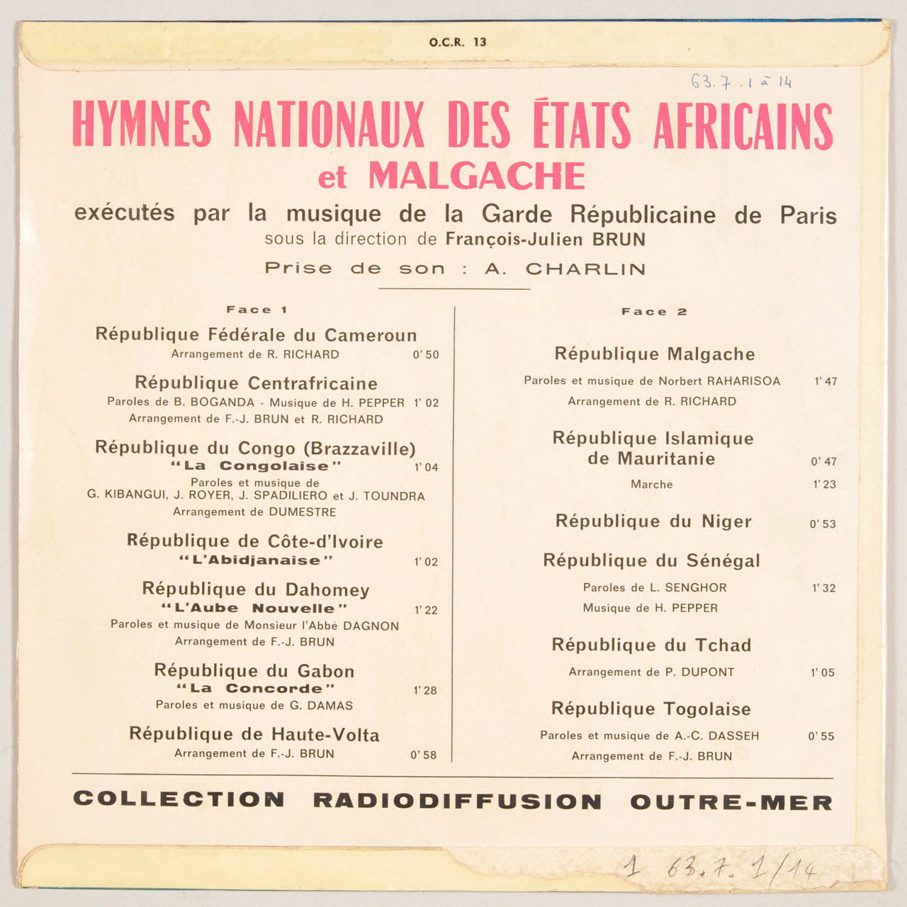 Cameroun, République Centrafricaine, République du Congo, Côté d'Ivoire, République du Dahomey (Bénin), Gabon, Haute-Volta (Burkina-Faso), Madagascar, Mauritanie, Niger, Sénégal, Tchad et Togo. Au dos, liste des titres. Au centre du disque, sur les deux faces, une étiquette circulaire en papier imprimé de couleur orange avec une écriture noire renseignant les titres, auteurs, exécutants et éditeur. Une carte de l'Afrique est dessinée en blanc.Matériaux et techniques