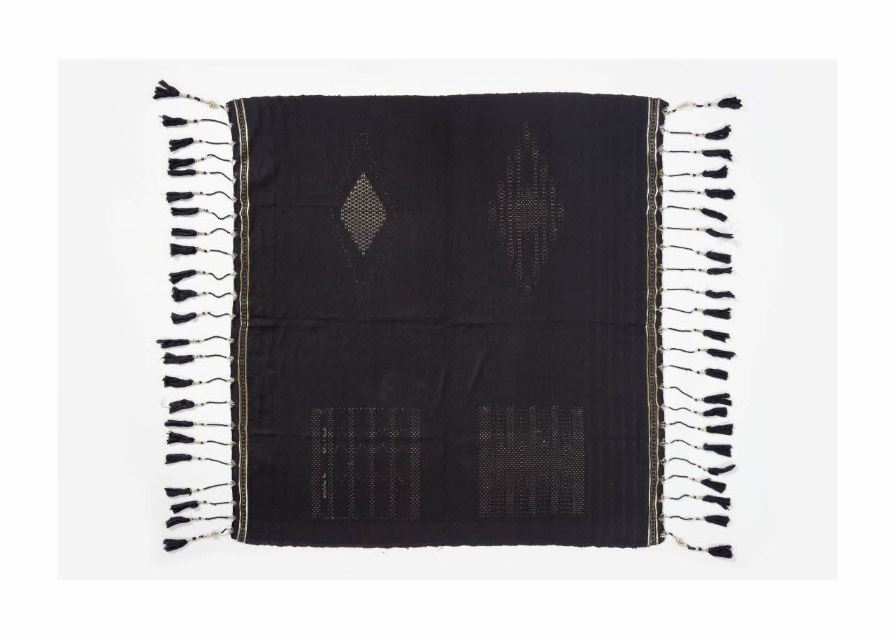 Ce Kesrawân est un grand châle presque carré noir avec des fils dorés et d'argent inclus dans le tissage.