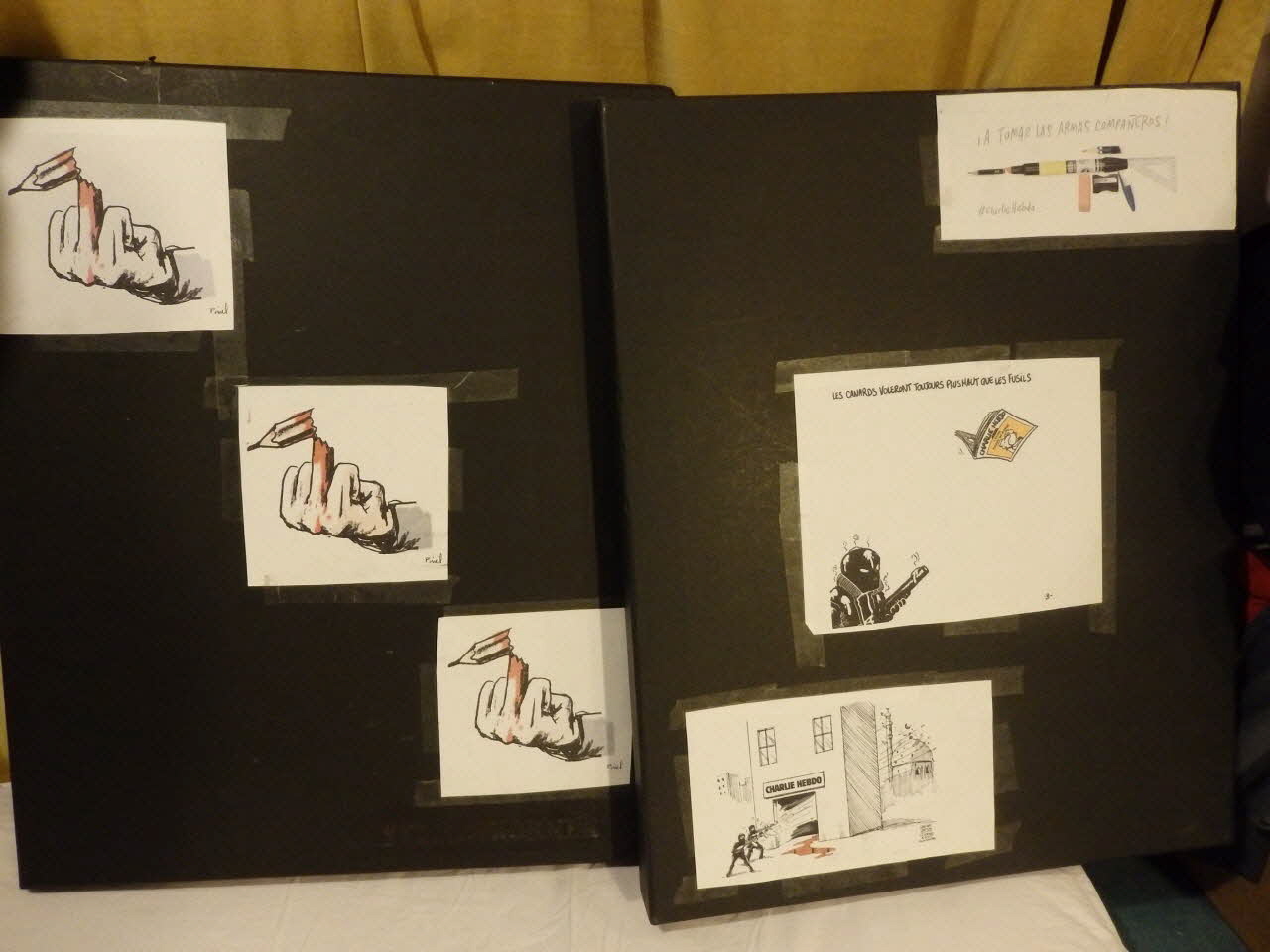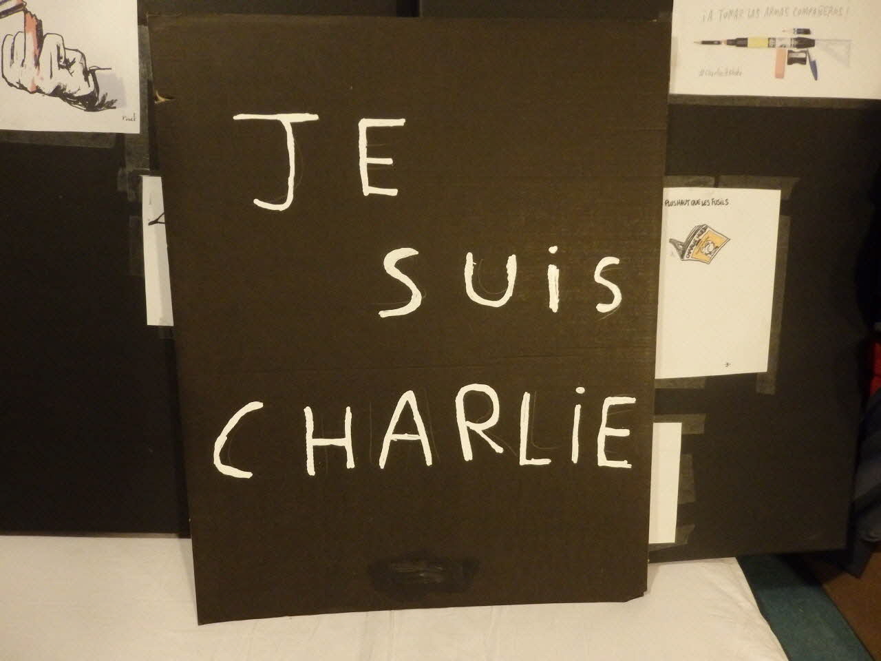 JE SUIS CHARLIE (boite 1), rectoCHARL(S'ECR)IE RESISTANCE (boite 1), rectoJE SUIS CHARLIE/ LES CONS M'ONT TUER/JE SUIS CHARLIE POLICIER/QU AVONS NOUS FAIT ? TOUS LES FRANCAIS SONT D'ACCORD!C'EST LA FIN DU MONDE!" (boite 1), versoA TOMAR LAS ARMAS COMPANEROS - #CharlieHebdo + LES CANARDS VOLERONT TOUJOURS PLUS HAUT QUE LES FUSILS + CHARLIE HEBDO (boite 2), rectoJE SUIS CHARLIE (affiche), rectoMatériaux et techniques