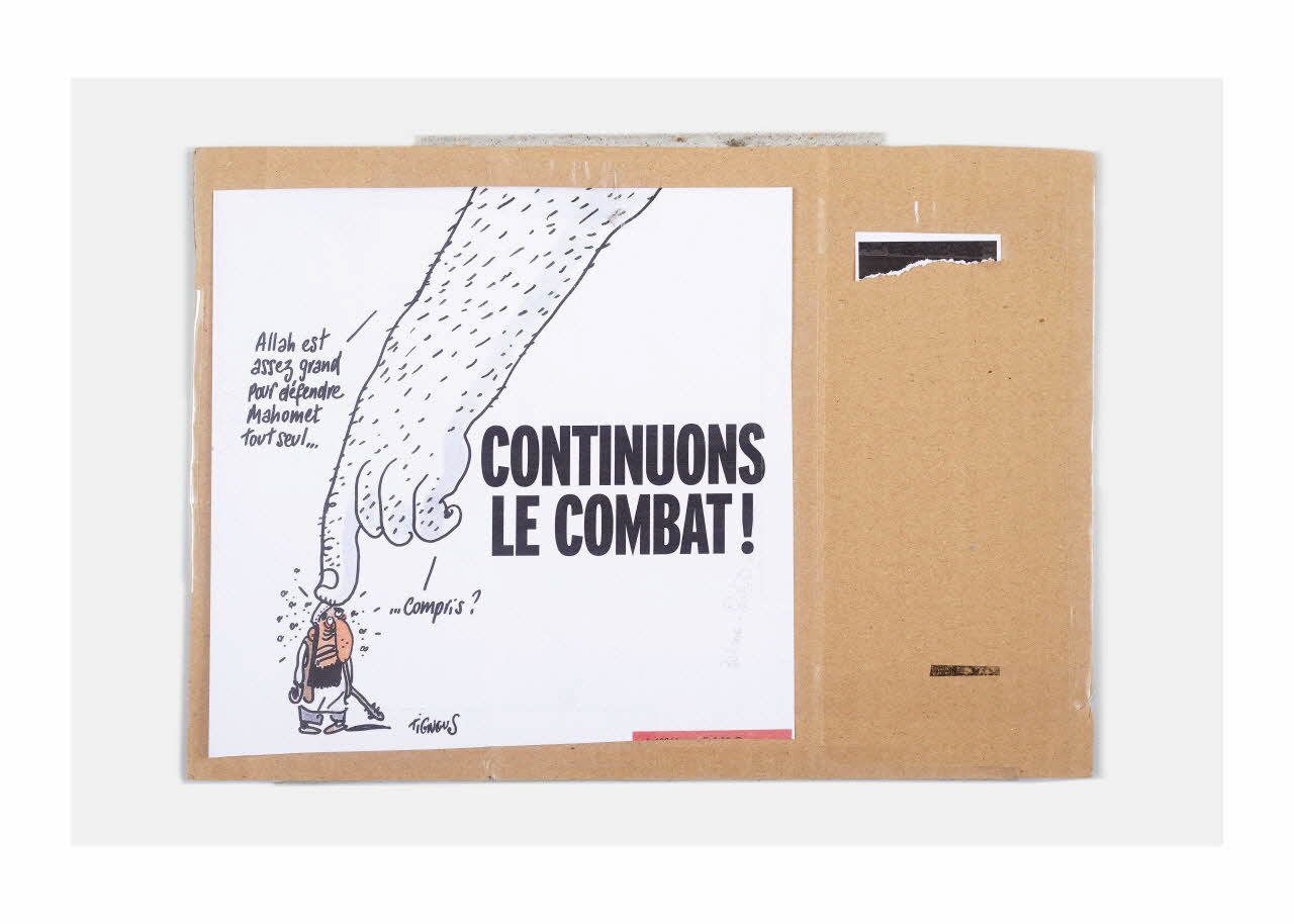 Pancarte constituée d'un panneau de carton de récupération scotché, sur lequel est collé une feuille de papier de format A4 et portant la mention AMI SI TU TOMBES,UN AMI SORT DE L'OMBRE A TA PLACE et au verso , le dessin de Tignous avec la mention ALLAH EST ASSEZ GRAND POUR DEFENDRE MAHOMET TOUT SEUL... COMPRIS ?/ CONTINUONS LE COMBAT-TIGNOUSInscriptions