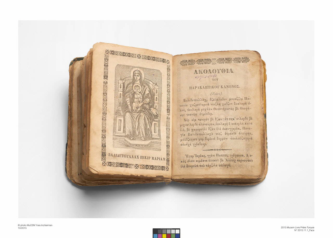 Lieu : TurquieCet ouvrage a appartenu à la grand-mère paternelle du donateur. D’origine arménienne, le grand-père du donateur a émigré aux Etats-Unis en 191, puis rentre en Turquie après le génocide de 1915 au cours duquel sa famille fut décimée. Il se remarie alors à Agios Konstantinos (actuelle Develi) avec une grecque (à qui appartenait cet ouvrage) et se convertit à l’orthodoxie. En 1922, le couple s’installe à Athènes, dans le cadre des échanges de populations à la fin de la guerre greco-turque, puis émigrent en France et s’installent à Bollène le 30 octobre 1929.