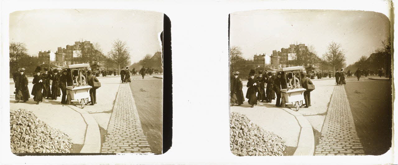 - Scène : avenue, arc de triomphe, arbre, calèche, femme, homme, marchand ambulant, pavé