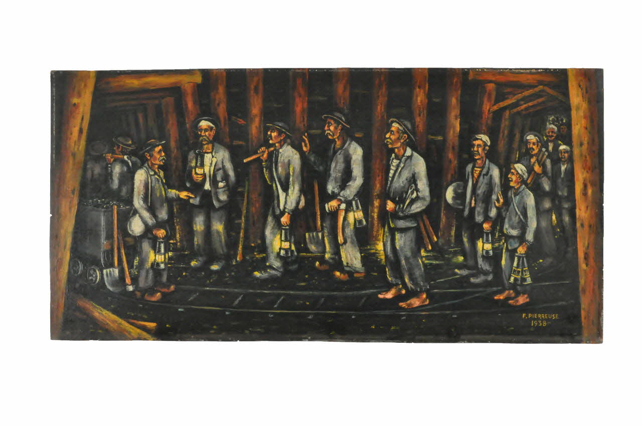 Le tableau représente une scène de mineurs dans un tunnel soutenu par des poutres en bois. Les mineurs sont vêtus d'un costume gris. Ils portent des lanternes et des pioches. Deux hommes sont pieds nus. Ils sont en file indienne près du rail où un wagon rempli de charbon est stationné sur la gauche.Inscriptions