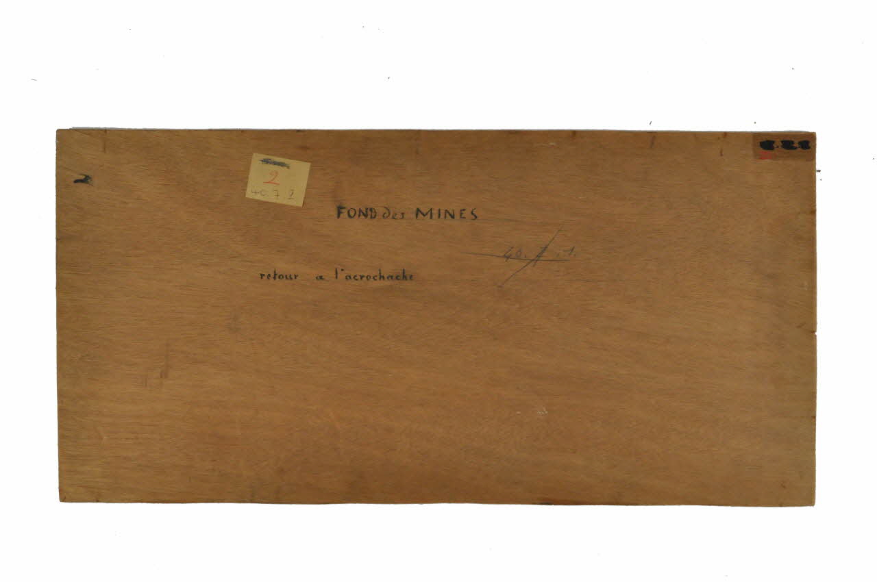 FOND DES MINES // retour à l'acrochache (Inscription manuscrite de couleur noire située au centre du revers de la peinture.), au centreDécor