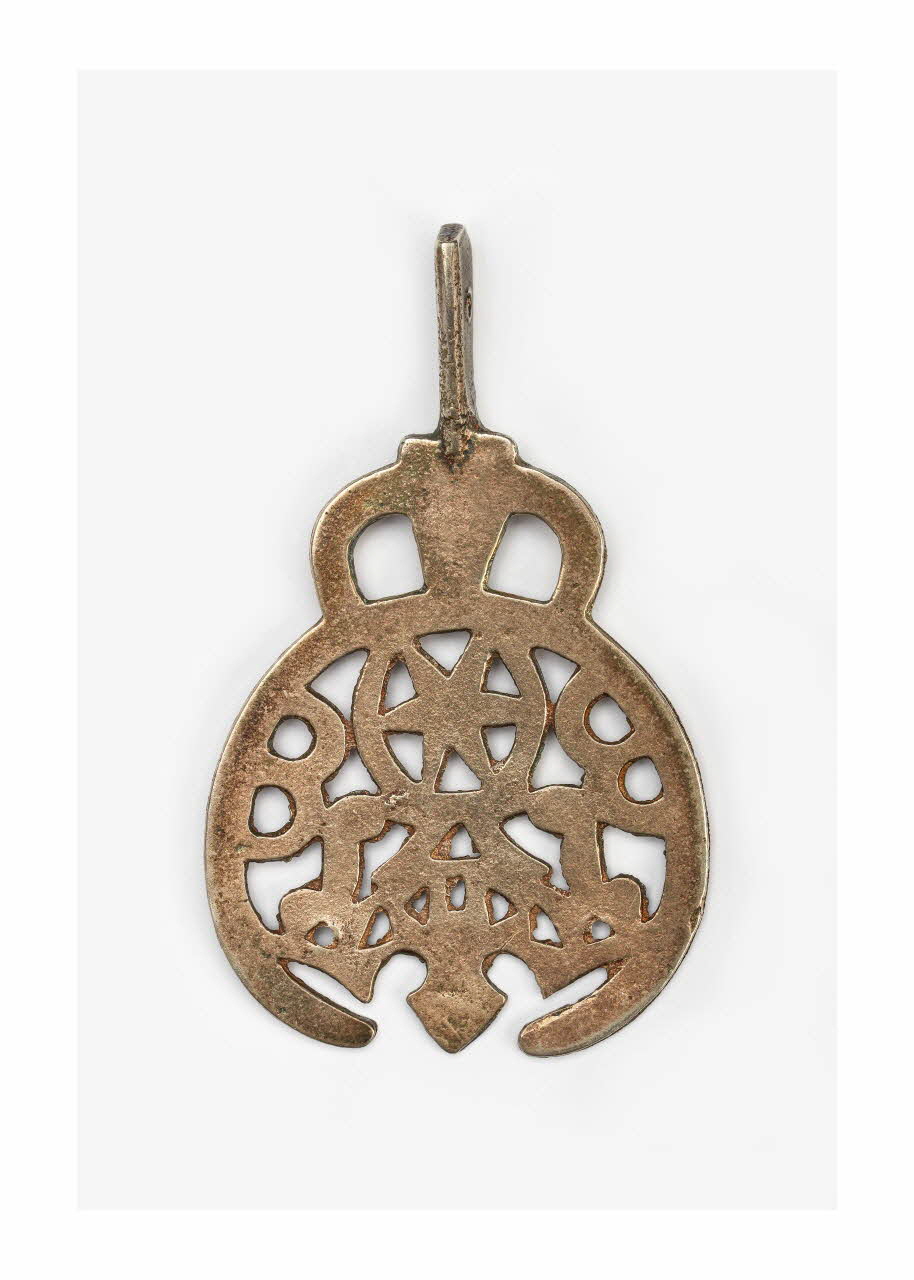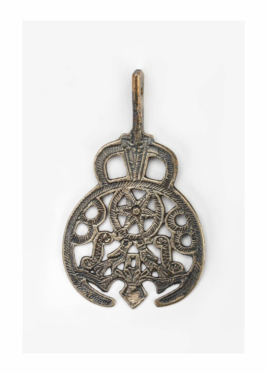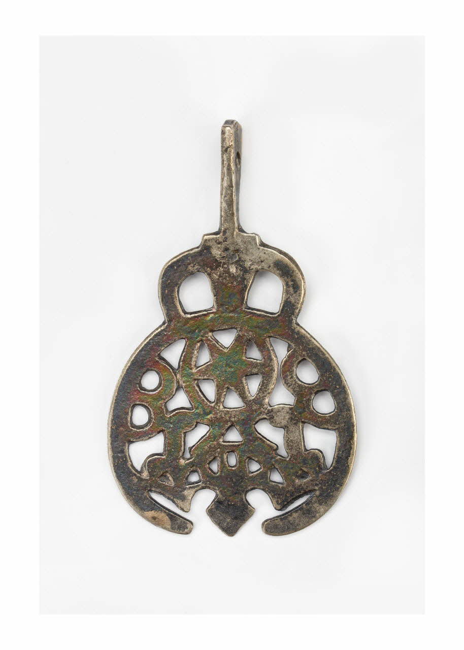 Lieu : TunisieBijoux du milieu du XXe siècle. D'après Samira Gargouri-Sethom, ce type de pendeloques seraient utilisées dans la région de Médénine, Tataouine. Le musée du quai Branly possède un collier fait de pendeloques semblables attribué à l'Egypte (70.2001.1.7) Le poinçon en forme de blason peut indiquer la Libye.