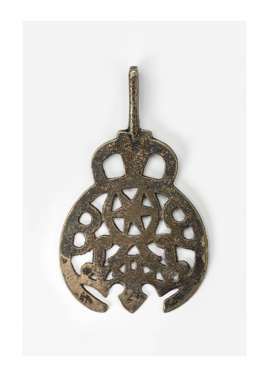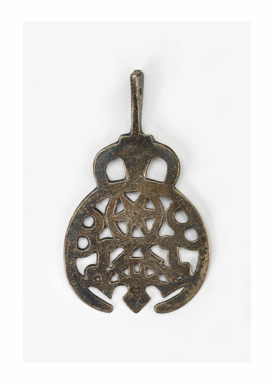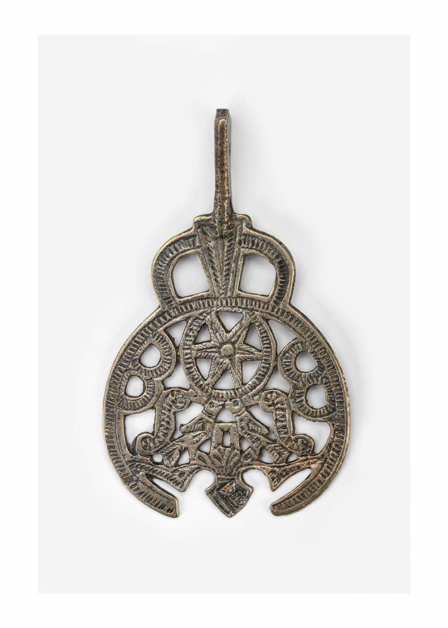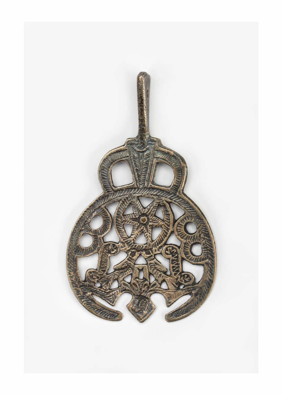 Lieu : TunisieBijoux du milieu du XXe siècle. D'après Samira Gargouri-Sethom, ce type de pendeloques seraient utilisées dans la région de Médénine, Tataouine. Le musée du quai Branly possède un collier fait de pendeloques semblables attribué à l'Egypte (70.2001.1.7) Le poinçon en forme de blason peut indiquer la Libye.