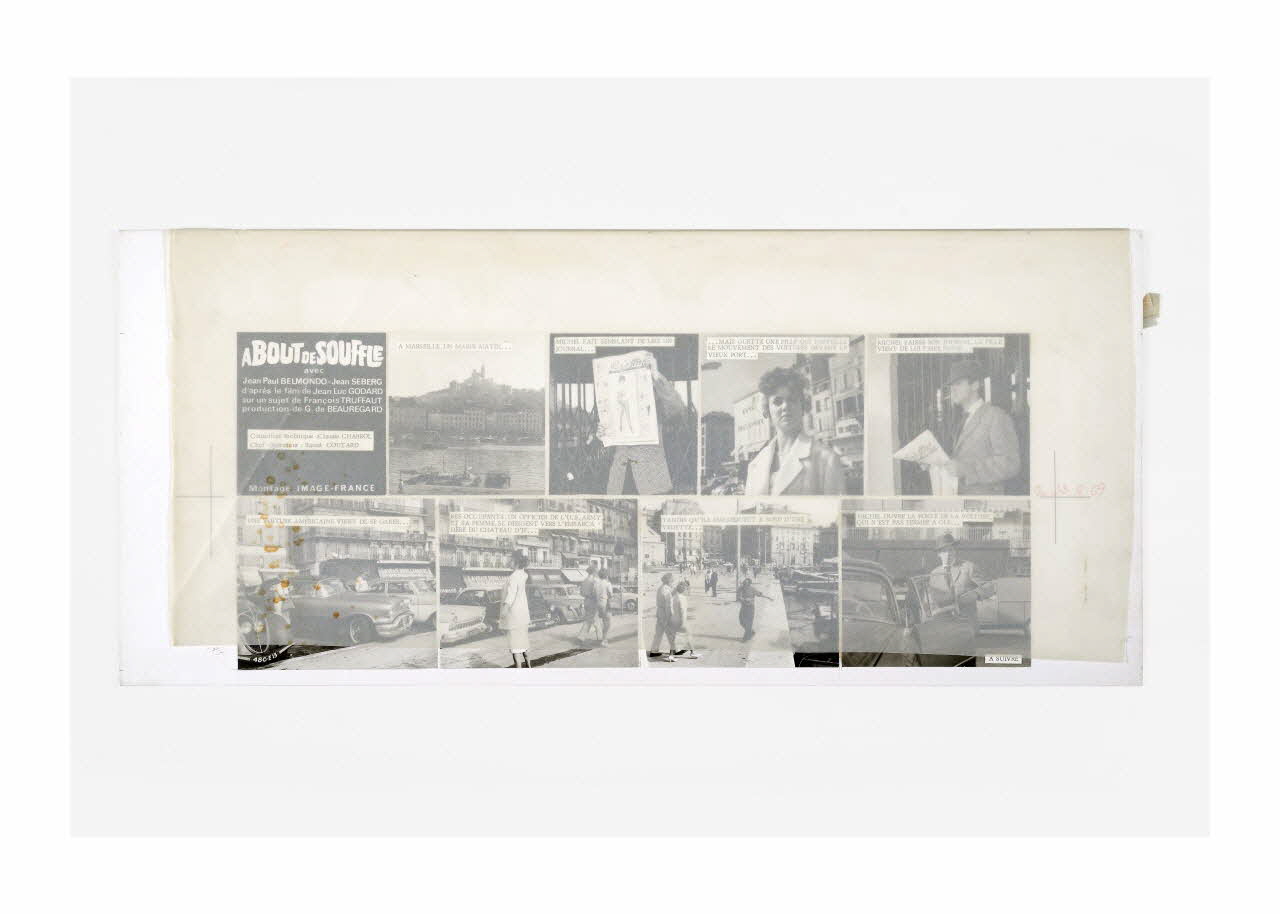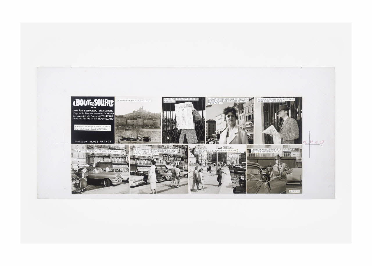 Lieu : Paris, Ile-de-France, FranceDate : 1959 - 1969Photographies réalisées lors du tournage du film "A bout de souffle" de Jean-Luc Godard. Les maquettes ont été réalisées en vue de la publication en plusieurs épisodes du ciné-roman dans le Parisien Libéré en 1969.