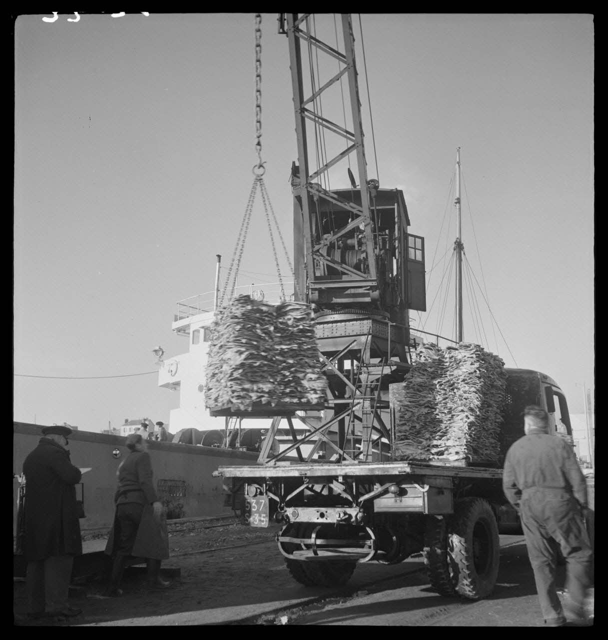 - Scène : homme, debout, port, bateau : chalutier, camion, grue, déchargement : poisson : morue