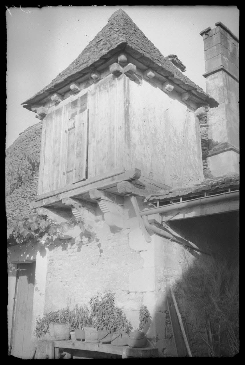 - Vue d'architecture : ferme, pigeonnier, poutre, encorbellement, toit, cheminée