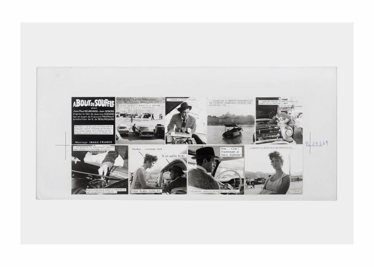 Lieu : Paris, Ile-de-France, FranceDate : 1959 - 1969Photographies réalisées lors du tournage du film "A bout de souffle" de Jean-Luc Godard. Les maquettes ont été réalisées en vue de la publication en plusieurs épisodes du ciné-roman dans le Parisien Libéré en 1969.