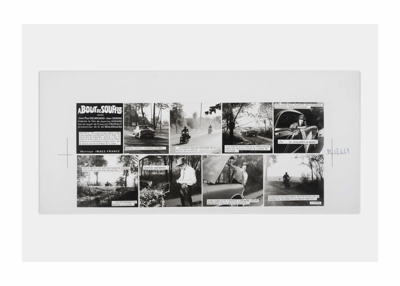 Lieu : Paris, Ile-de-France, FranceDate : 1959 - 1969Photographies réalisées lors du tournage du film "A bout de souffle" de Jean-Luc Godard. Les maquettes ont été réalisées en vue de la publication en plusieurs épisodes du ciné-roman dans le Parisien Libéré en 1969.