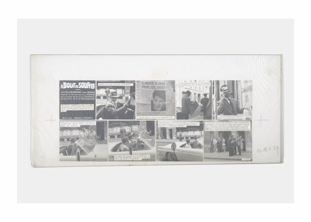 Lieu : Paris, Ile-de-France, FranceDate : 1959 - 1969Photographies réalisées lors du tournage du film "A bout de souffle" de Jean-Luc Godard. Les maquettes ont été réalisées en vue de la publication en plusieurs épisodes du ciné-roman dans le Parisien Libéré en 1969.