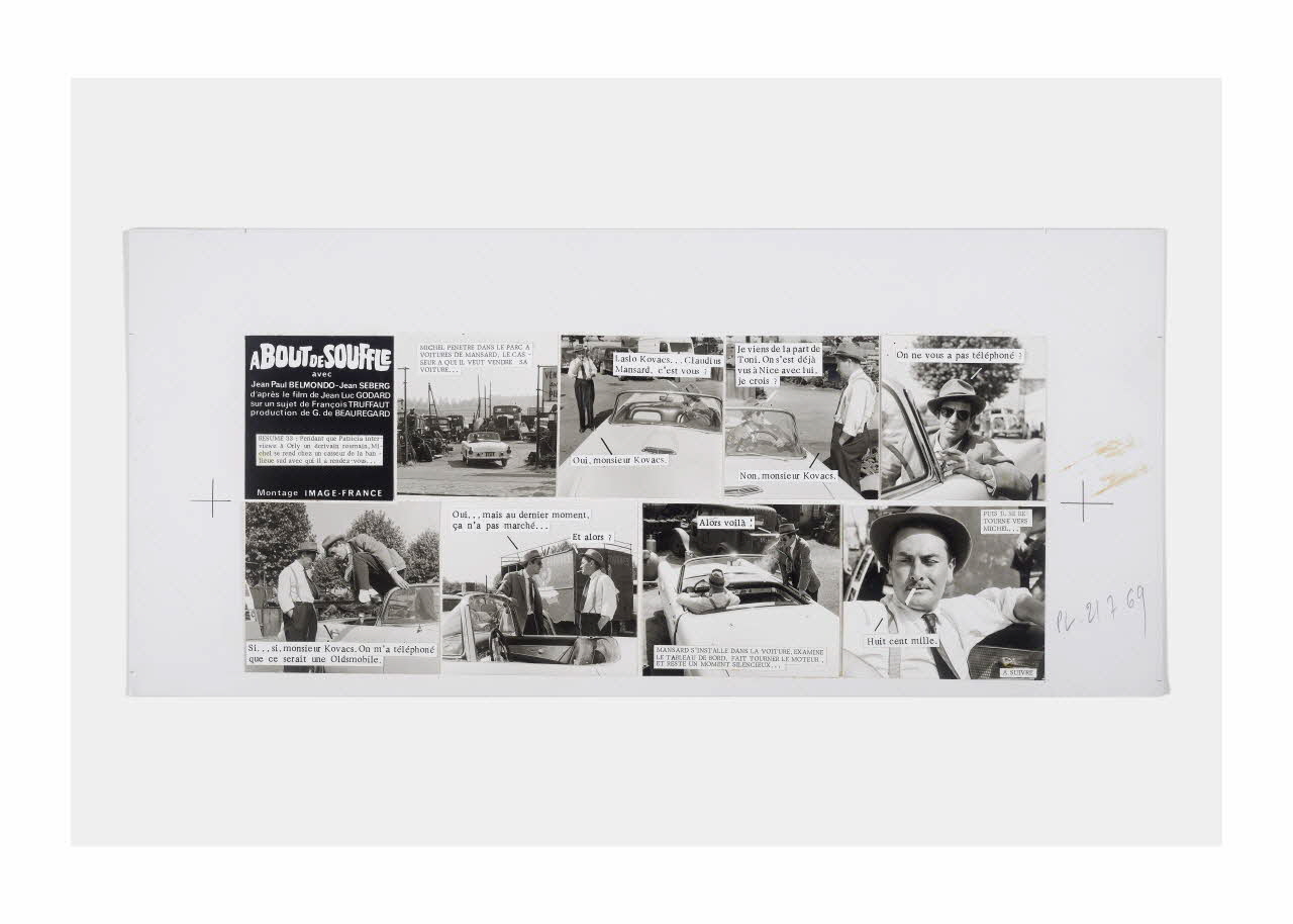 Lieu : Paris, Ile-de-France, FranceDate : 1959 - 1969Photographies réalisées lors du tournage du film "A bout de souffle" de Jean-Luc Godard. Les maquettes ont été réalisées en vue de la publication en plusieurs épisodes du ciné-roman dans le Parisien Libéré en 1969.