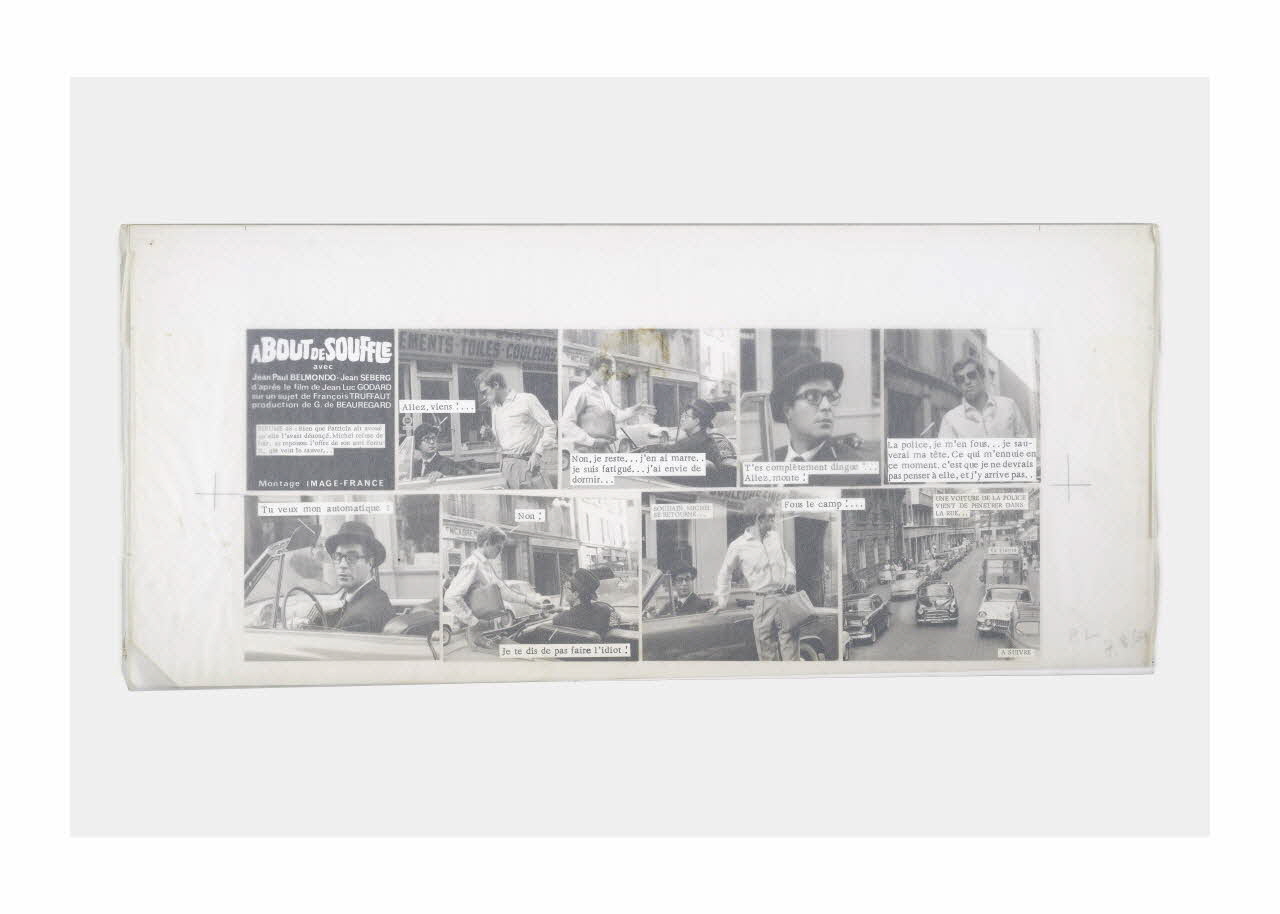 Lieu : Paris, Ile-de-France, FranceDate : 1959 - 1969Photographies réalisées lors du tournage du film "A bout de souffle" de Jean-Luc Godard. Les maquettes ont été réalisées en vue de la publication en plusieurs épisodes du ciné-roman dans le Parisien Libéré en 1969.
