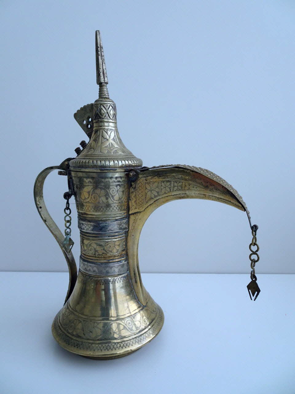 La forme de cette verseuse est plutôt caractéristique de l'est de la péninsule arabique, des ateliers d'al-Hasa (notamment Hofuf), mais les productions de ces ateliers se retrouvent dans toute l'Arabie. On la trouve également au Qatar et aux Emirats Arabes Unis. Le foyer principal de la fabrication des cafetières est la région d'al-Hasa, où l'on fabriquait des modèles adaptés aux goûts de différentes régions de la péninsule. Les cafetières typiques d'al-Hasa ont un bec verseur large, profond et pointu, souvent couvert d'un clapet qui se termine en anneau auquel est accrochée une pendeloque décorative en métal. Ils sont en général abondamment décorés – jusqu’à la poignée – de motifs tracés par des pointillés martelés dans le métal. Parfois le corps du récipient est fait en laiton, mais le plus souvent il est en cuivre.