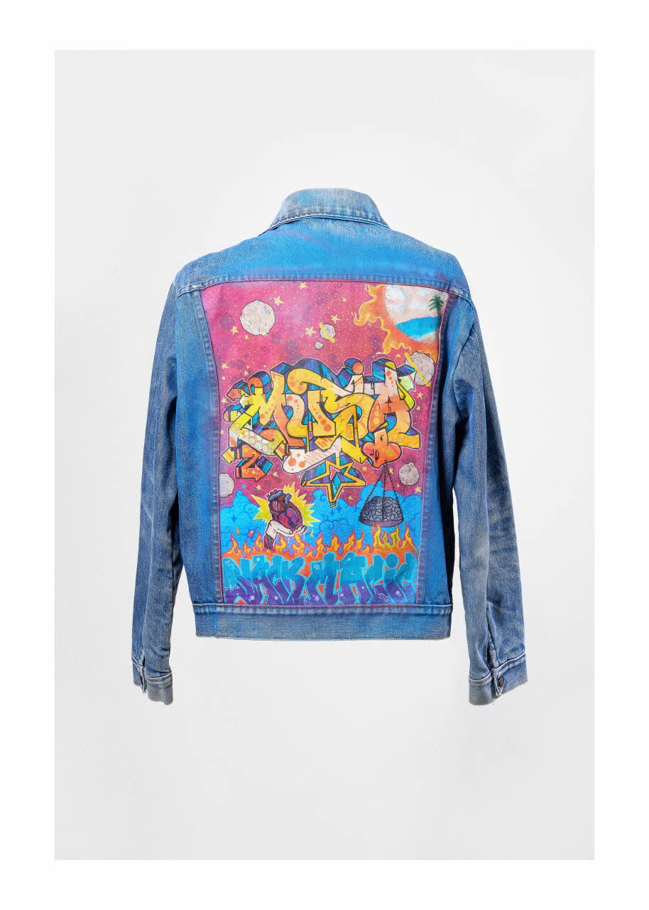De : Lieu : Barcelone, Catalogne, EspagneDate : 2011Extrait du rapport d'enquête de Jean-Guy Solnon, campagne graffiti en Espagne, 2016 : Dans la plus pure lignée des blousons en jeans customisés des débuts du hip hop, Musa signe ici une illustration à mi-chemin entre surréalisme et psychédélisme galactique. Le lettrage Black Magic au bas de la pièce fait référence à son appartenance à ce crew espagnol composé de Crime, Hen, Jank, Ms1, Musa, Nexie, Noise, Smote, Sher y Ovas.