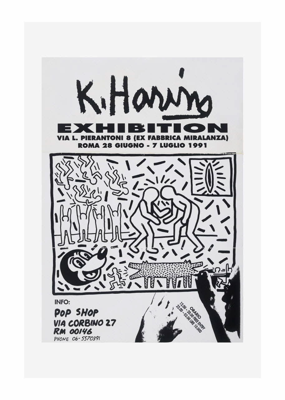 Lieu : Rome, Latium, ItalieDate : 1991Extrait du rapport d'enquête de Christian Omodeo, campagne graff en Italie, 2015 : Affiche de l’inauguration d’un faux Pop Shop de Keith Haring en 1991 à Rome, mais qui n'a pas été approuvé par l'artiste.