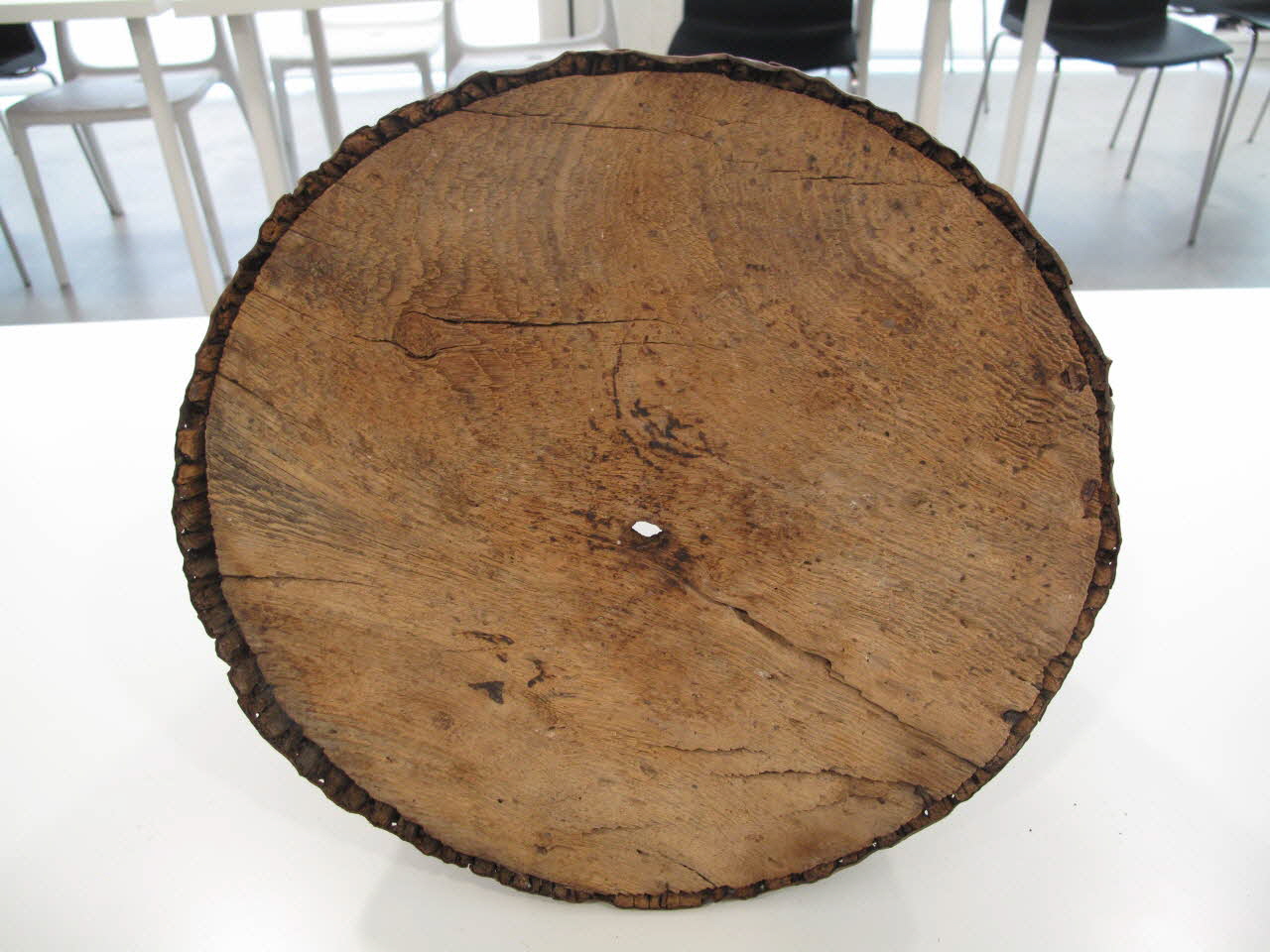 Sur plan rond, de forme conique, constitué de lamelles de bois insérées sur deux plaques de métal assemblées par sept rangées de clous. Le fond est perforé d'un orifice.Matériaux et techniques