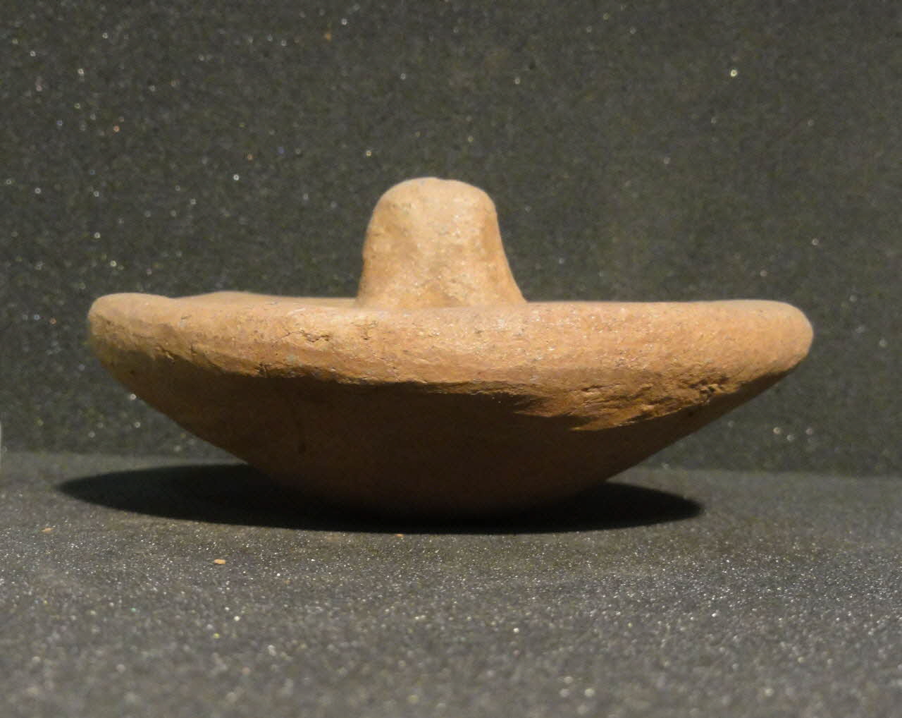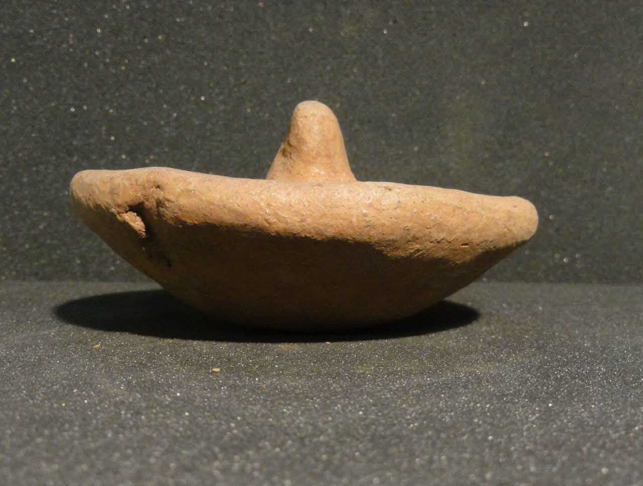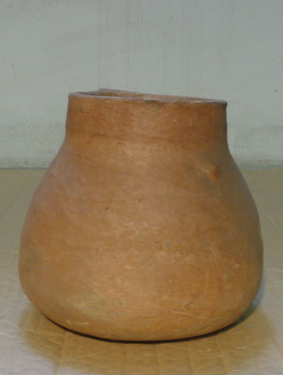 Lieu : Higâza, Qûs, Qena, EgypteDate : 1979La pâte est constituée pour moitié de limon du Nil, pour moitié de talc. Après séchage, la pièce est légèrement imbibée d'oxyde de fer et de talc avec un chiffon, puis polie avec un galet. La protubérance sur la paroi est une marque de potier pour distinguer la production d'un atelier de celle des autres.
