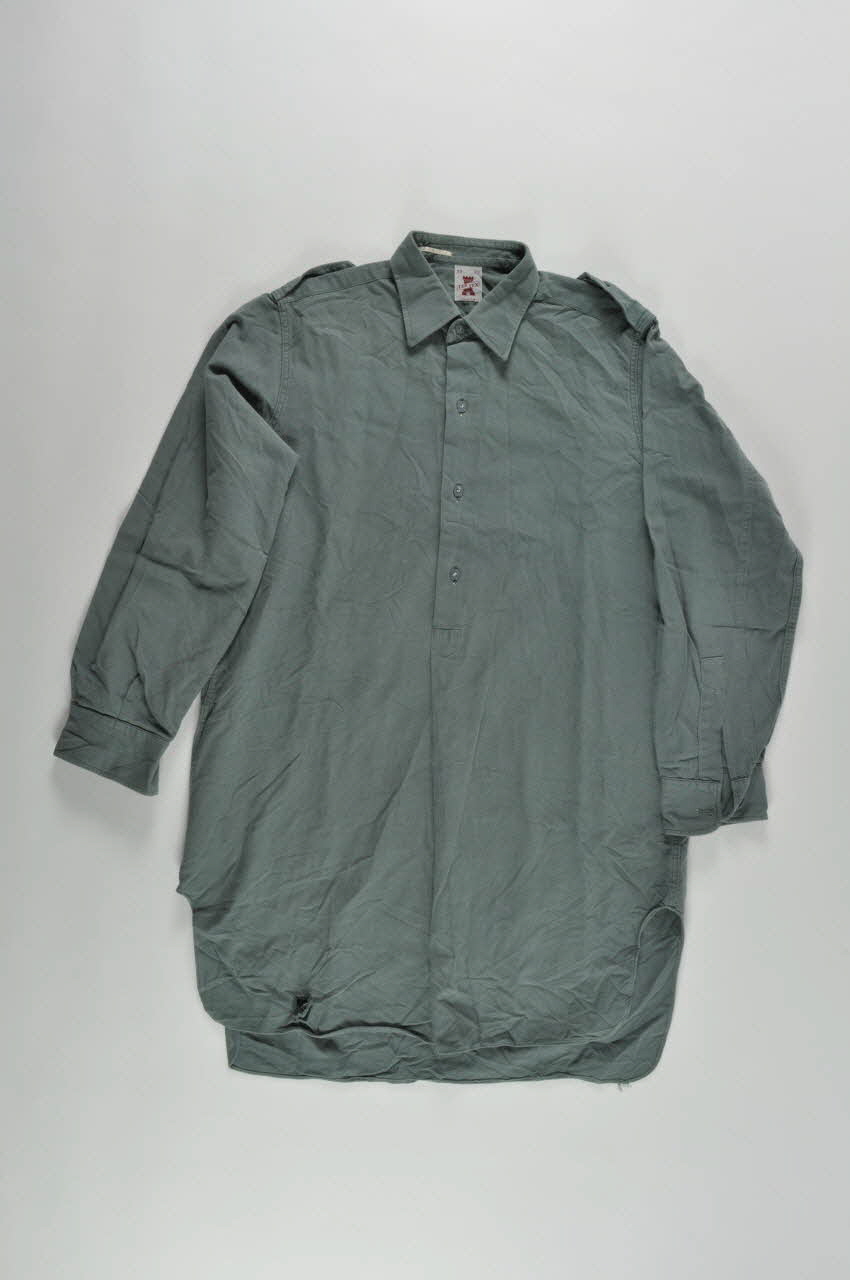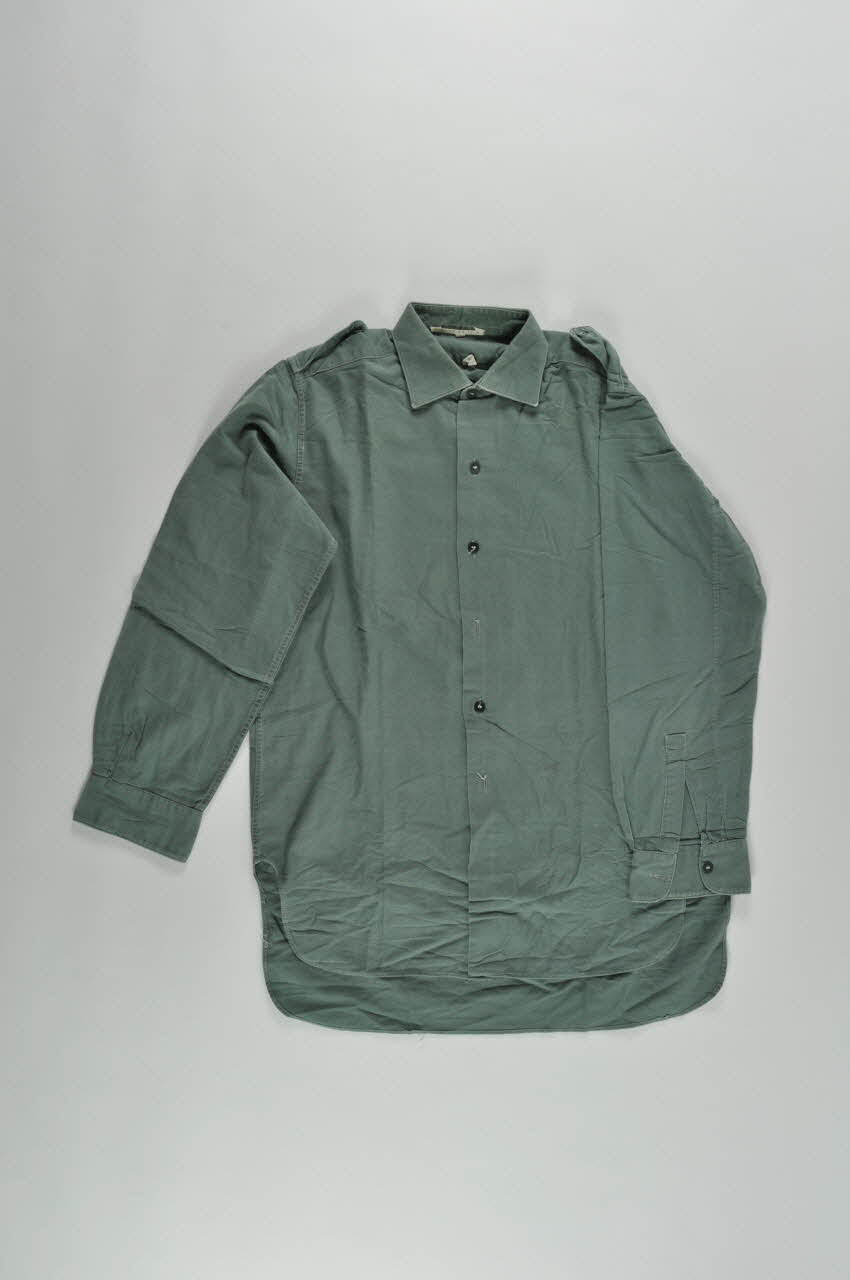 Lot de trois longues chemises en toile de coton vert, à longues manches garnies d'épaulettes boutonnées.