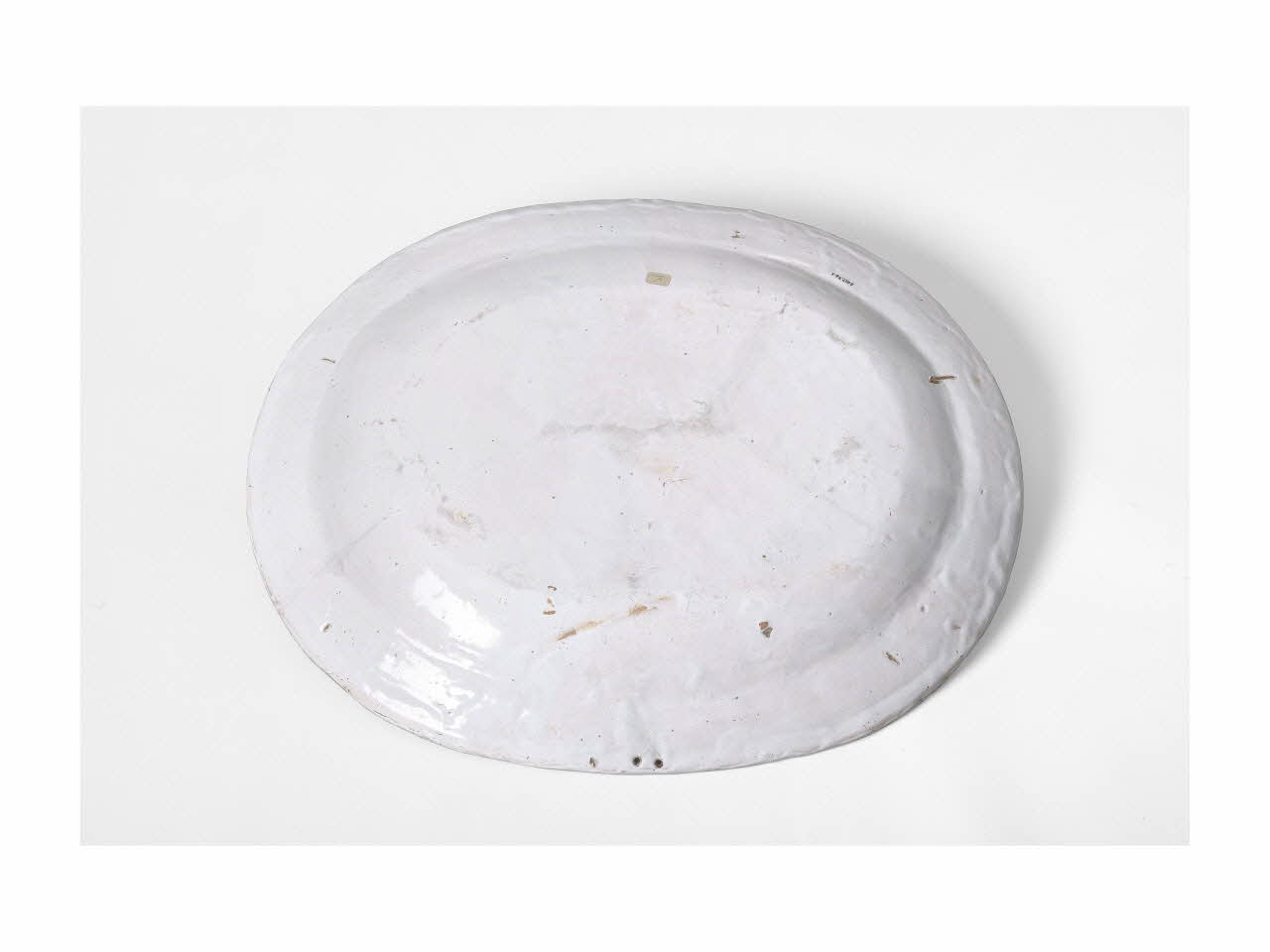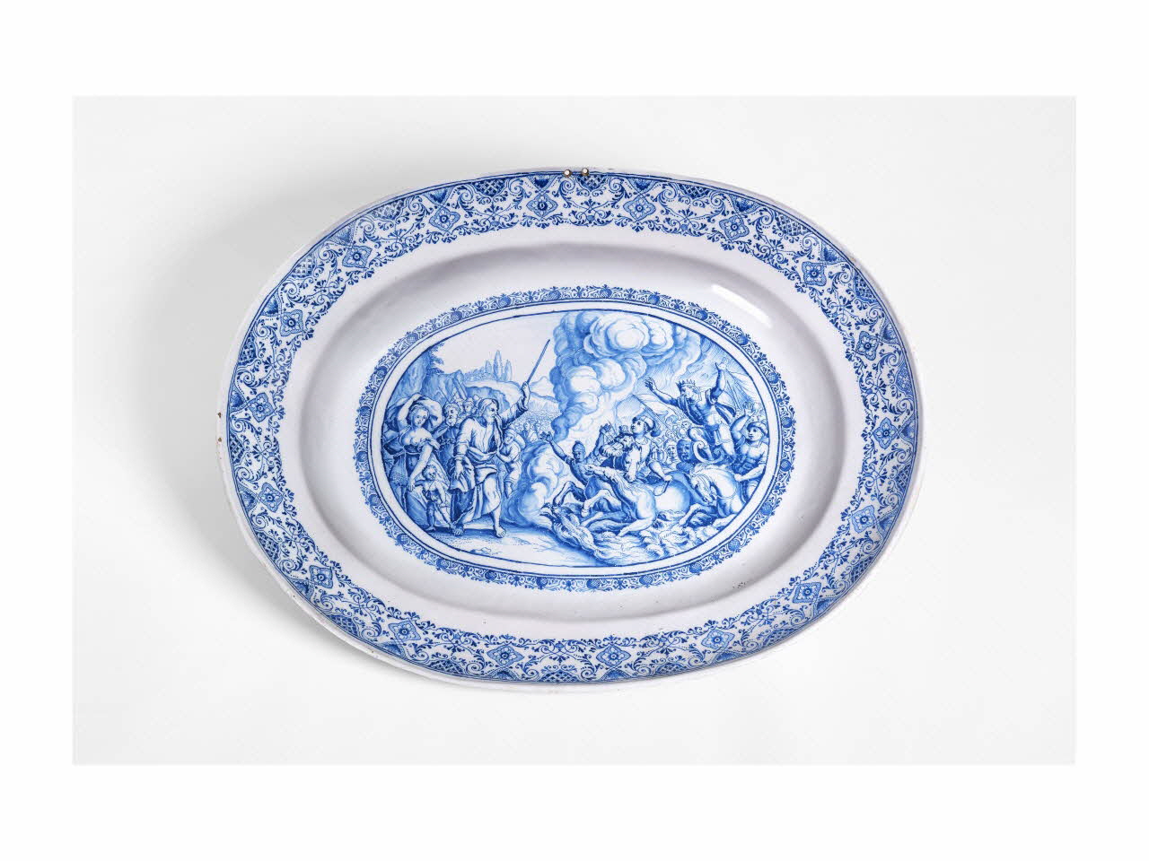 Lieu : Marseille, Bouches-du-Rhône, Provence-Alpes-Côte d'Azur, FranceCe plat de grandes dimensions est un bon exemple de vaisselle ostentatoire : les deux trous dans la lèvre, à la verticale de l’image centrale, le désignent en effet comme une pièce destinée à être suspendue. Exhibée dans un intérieur aisé, cette pièce affichait les moyens du maître des lieux en même temps que son décor révélait ses valeurs morales. La collection d'où provient cette pièce est issue d'une bastide marseillaise (d'après le catalogue de la vente).
