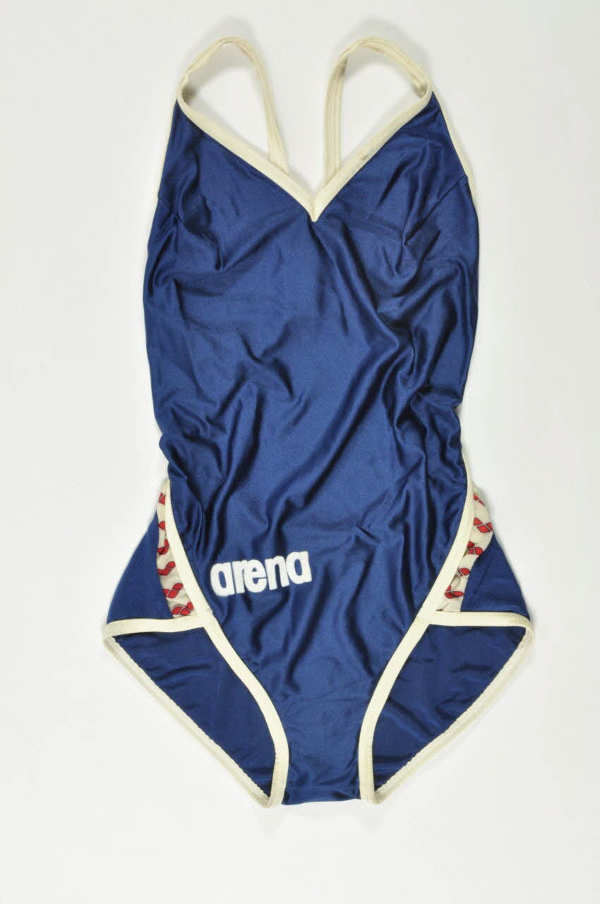 Maillot de bain bleu à bretelles, de la marque Aréna, dos coupé, impressions de dessins géométriquessur les hanches.