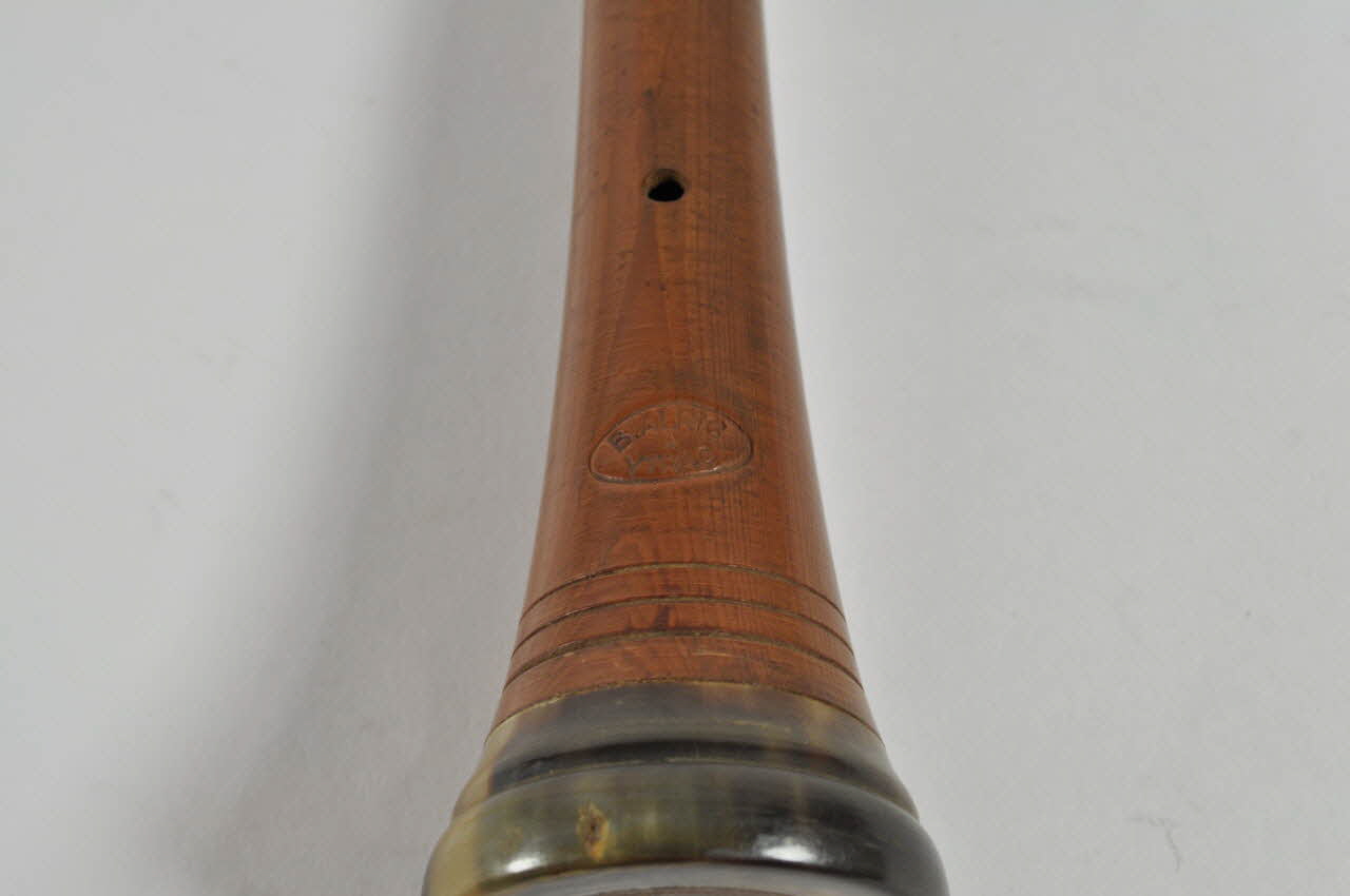 Ce tuyau mélodique de cabrette est en buis avec des viroles en corne brune à chaque extrémité. L'une fait office de pavillon. Le tuyau est percé de 8 trous de jeu (l'avant-premier en bas est décallé à droite) . A l'arrière, deux trous d'accord sont percés, l'un en haut, l'autre en bas. Trois lignes parallèles en bas et une ligne en sont gravées.Décor